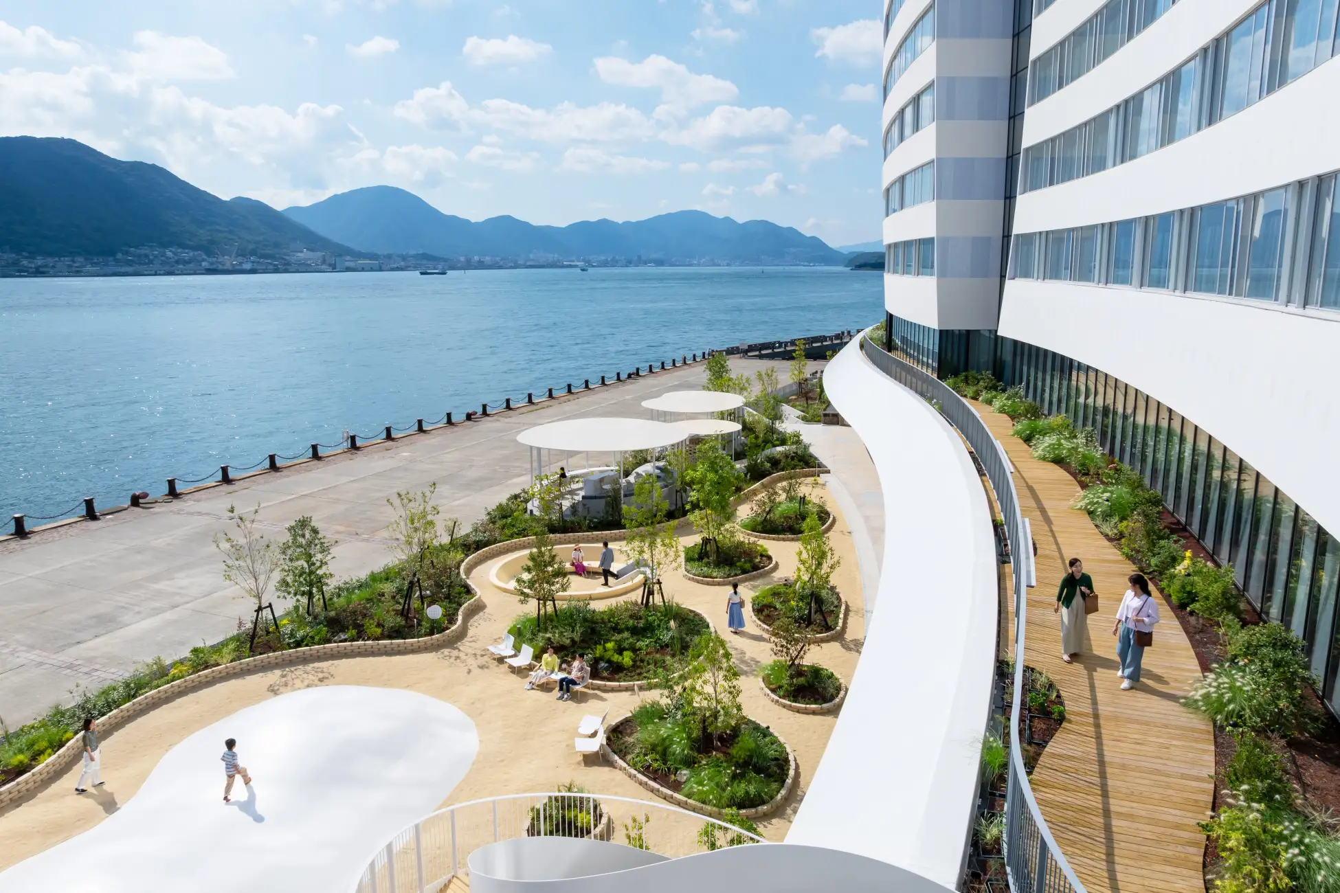 リゾナーレ下関は、関門海峡の景色や「ふぐ」など、この地域ならではの要素を随所に取り入れた建築デザインが特徴です。客室は、すべての部屋から関門海峡の景色を楽しめます。どの客室も、壁やインテリアは関門海峡の海の色から着想を得たエメラルドグリーンを基調とし、関門海峡の景色になじむデザインです。「なみなみテラス」は、先端にいくほど傾斜が強くなる、波のようなデザインが特徴です。芝生エリアや、寝そべってくつろげるソファ、カウンター席を設え、時間によって表情を変える関門海峡の景色を楽しめます。「ふぐビーチ」は、砂浜のように砂が敷き詰められ、子どもがはねて遊べる「ふわふわドーム」やソファ、植栽をふぐの柄のように設えています。ふぐをモチーフにした大胆で遊び心のあるデザインが特徴の「ふぐプール」の全天候型屋内プールは、子供のプールデビューにも最適です。