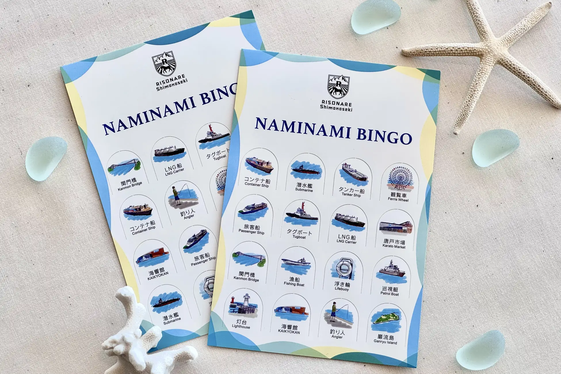 リゾナーレ下関では、関門海峡を楽しみ尽くす多彩なアクティビティを提供します。「はじめての関門海峡」は、船に乗って関門海峡の特徴や交通ルールを楽しく学べるアクティビティです。また、ふぐの展示種類数世界一を誇る市立しものせき水族館「海響館」監修のホテルスタッフによる「海響館講座」を毎晩開催しています。その他、関門海峡の景色や行き交う船をビンゴゲームを通して楽しむことができる「なみなみビンゴ」や、ペットボトルキャップをアップサイクルしたオリジナルチャーム作り、貝殻やシーグラスを使ったオリジナルアート作りなど様々なアクティビティを提供しています。
