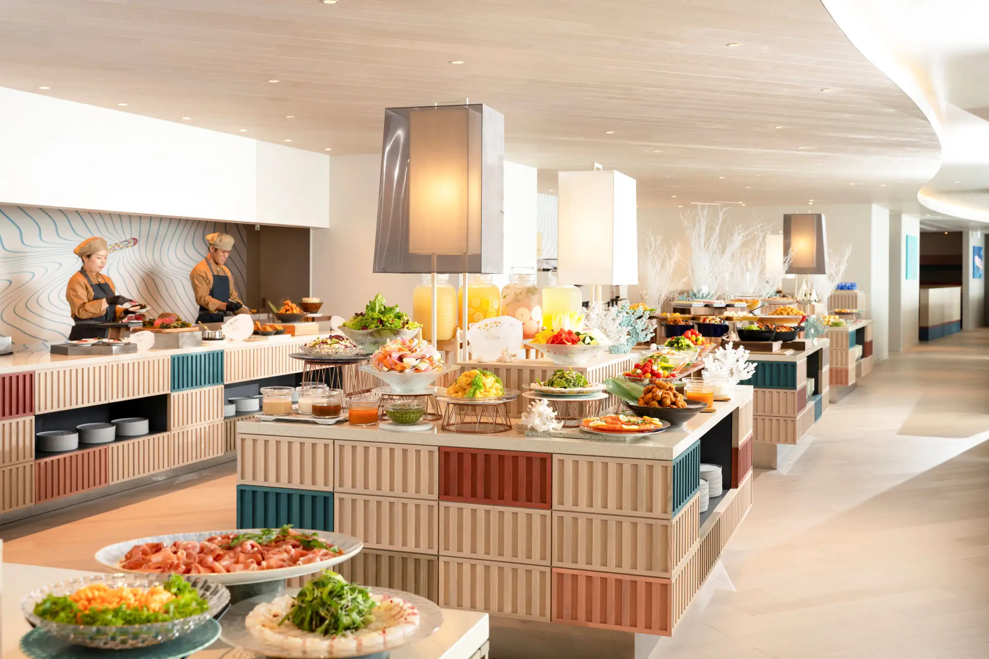 「PUKU PUKU」は夕食、朝食を提供するビュッフェダイニングです。夕食では、から揚げやブイヤベースといった種類豊富なふぐ料理や、海藻で包んで焼き上げたローストビーフを提供。朝食では、下関の郷土料理をアレンジした、ふぐ出汁と味わう「瓦そば」や、夏みかんソースと味わうフレンチトーストなどを提供し、この地域ならではの食材やメニューを存分に楽しめます。
