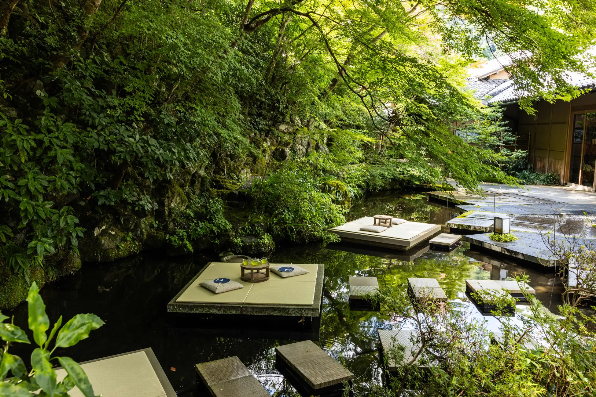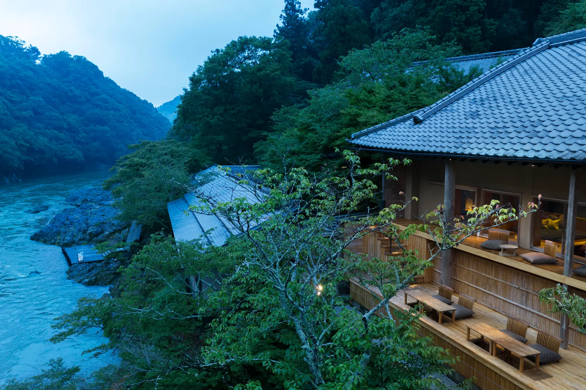 平安貴族が興じた嵐山にたたずむ水辺の私邸で時を忘れる。渡月橋から船に乗り、大堰川を遡った先では、京都に息づく日本の伝統技法を感じる客室、嵐山の情景を映した滋味豊かな日本料理、四季の美しい景観と静けさの非日常が提供されます。