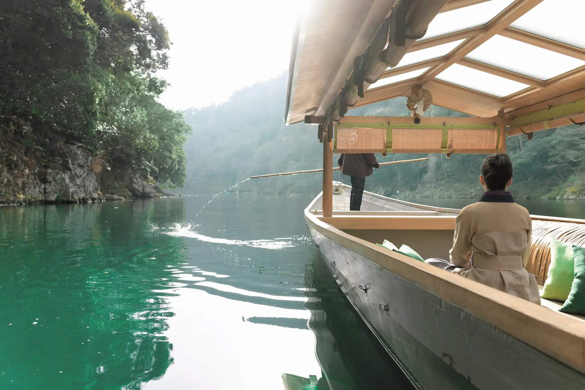 星のや京都の目の前を流れる大堰川(おおいがわ)に、星のや京都専用の屋形舟・翡翠を浮かべ、嵐山の風景を愛でながら和菓子と抹茶を楽しみます。二十四節気(*2)の清明(せいめい)から穀雨(こくう)にかけては、柔らかな陽光の中で若葉が一斉に芽吹く、生命力に満ちた時期です。そこから立夏には瑞々しく青い新緑へ、大暑(たいしょ)には深く静まりかえる万緑へと、景色は刻一刻と表情を変えていきます。その季節、瞬間ならではの嵐山の移ろう景色を愛でる体験です。