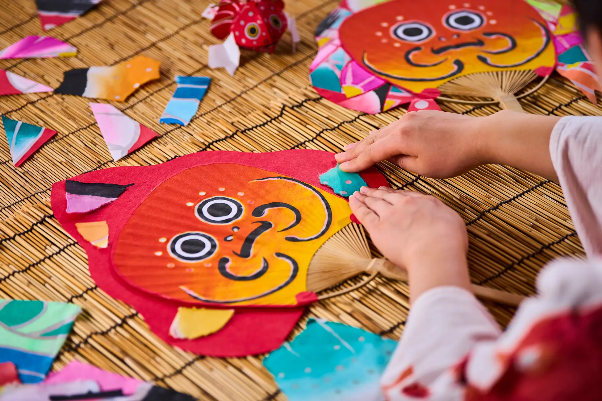 毎年8月に青森市で開催される青森ねぶた祭。祭りで出陣した大型ねぶたは、役目を終えると解体され、使用された和紙も廃棄されます。このプログラムでは、廃棄予定だった和紙を再利用。色や絵柄の異なるパーツをちぎり、貼り合わせて作る「金魚ねぷたうちわ」が新登場します。ねぶた師の技術が詰まった和紙を使い、自分だけの一枚に仕上げられるのが特徴です。館内や公園で過ごす時、みちのく祭りやのショーを鑑賞する時にも使え、滞在の思い出を形に残せます。