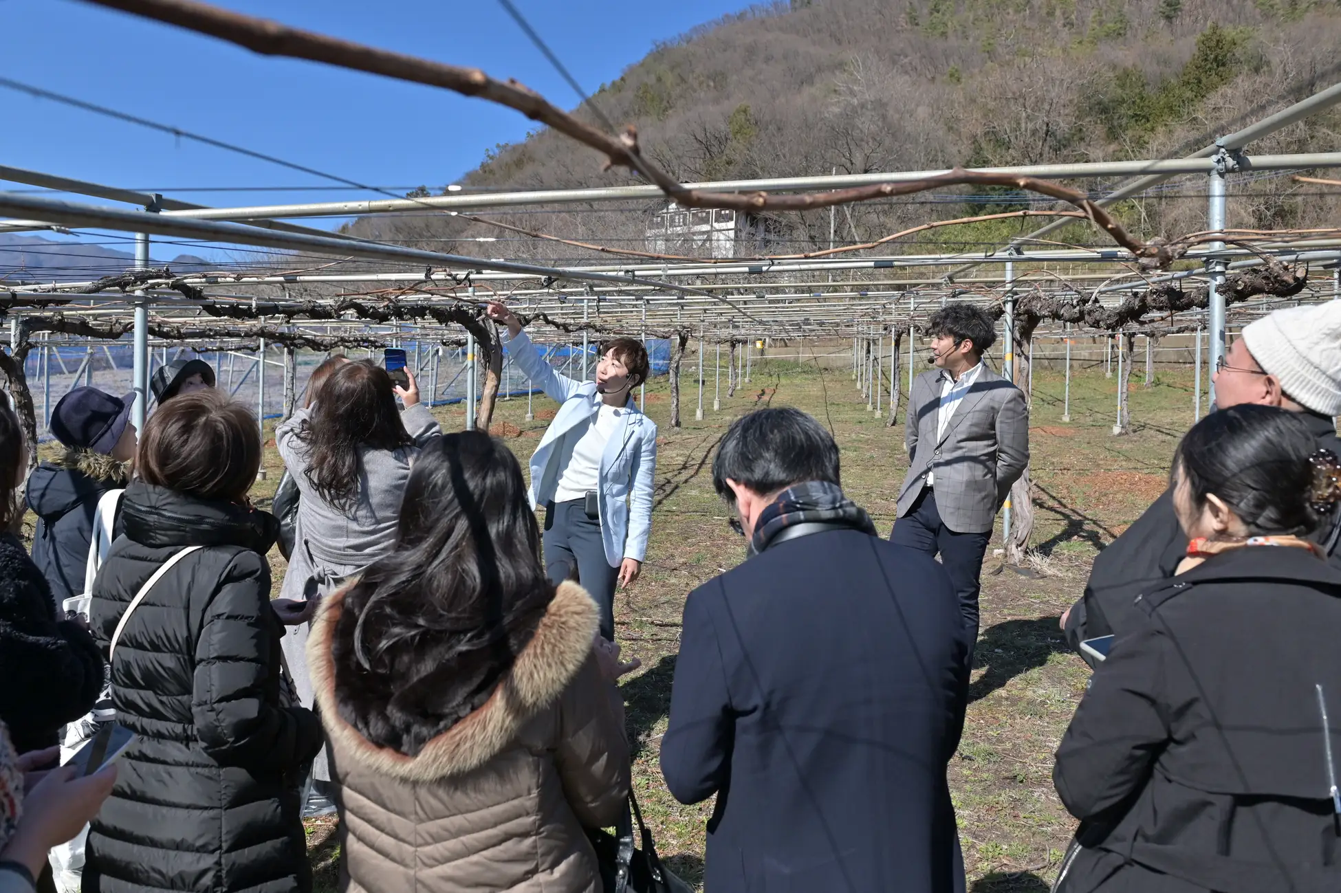 参加者は、山梨県甲州市塩山にあるKisvin Wineryの葡萄畑とワイナリーを訪れました。斎藤まゆ氏が、塩ノ山や富士山を望む開放的な景観が広がる葡萄畑と、通常は公開していないワイナリーを案内しました。ワイナリーでは、バトナージュ(*3)の前後で変化するワインの様子を見比べたほか、ワインボトルへのラベリング作業を見学するなど、Kisvin Wineryのワインが造られる過程を深く知る機会となりました。