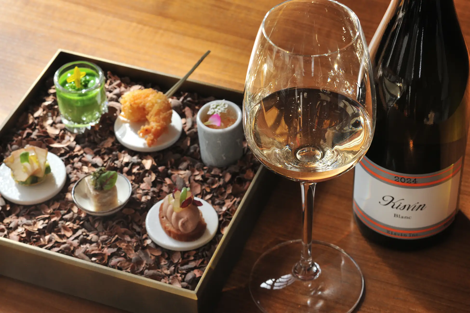メインダイニング「OTTO SETTE」では、この日のためにKisvin Wineryのワインをより深く味わうために考案された、こだわりの料理を提供しました。例えば、しっかりとした骨格と苦みが特徴の「Kisvin Koshu Reserve 2022」には、山菜の苦味とチーズやクリームをふんだんに使用した「山菜のトルタ」を合わせました。ワインの樽香とトルタの生地の香ばしさが重なり、ワインと料理の両方の風味を引き立てました。参加者は、斎藤まゆ氏とリゾナーレ八ヶ岳のソムリエ 加茂文彦の解説とともに、ワインを軸に構成された全8皿の料理とのマリアージュを堪能しました。