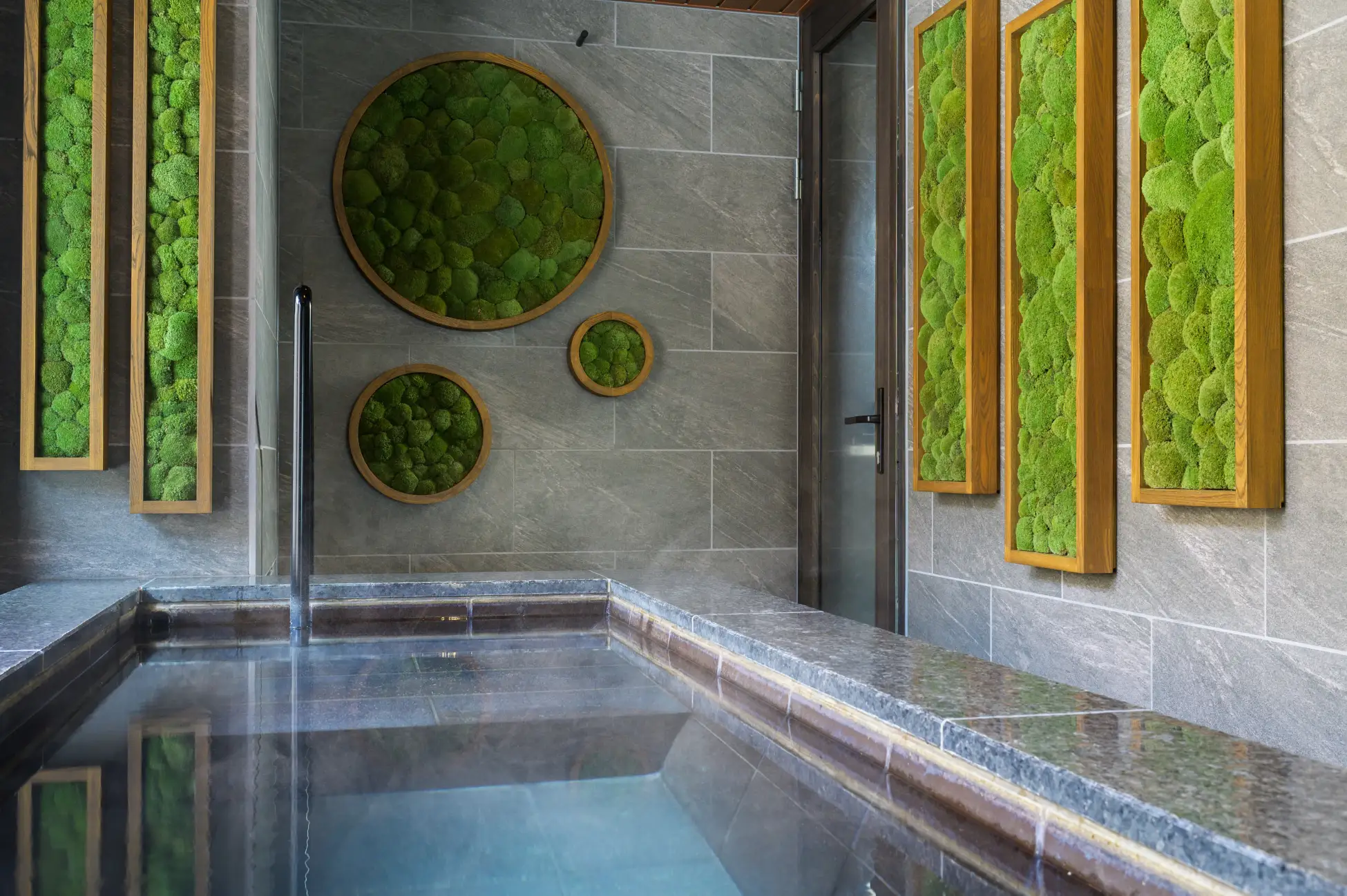 特徴1 壁一面の苔に囲まれたユニークな入浴体験【Power Up】
