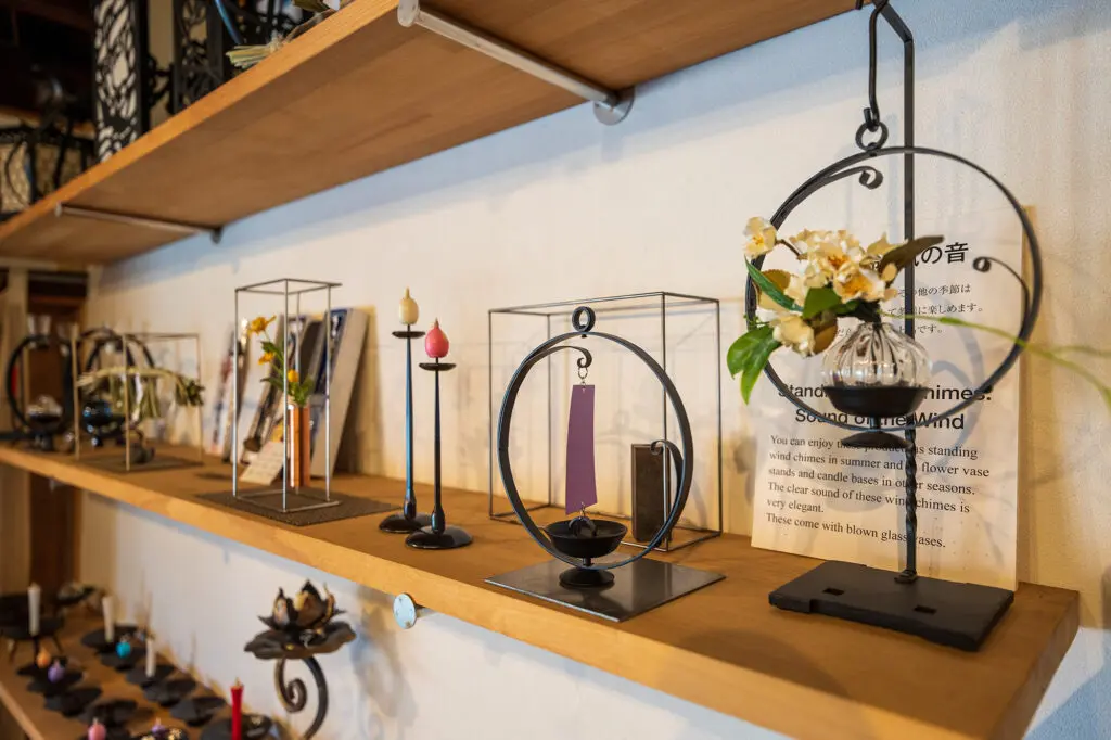 鍛造体験後には、工房に併設するギャラリーにて、鍛冶職人と、出雲地域に深く根付く火と向き合うものづくりの精神や、全国の鉄師たちが厚く信仰する鉄の神様「金屋子神(かなやごしん)」にまつわる伝承など、この地ならではの貴重なエピソードを学びます。また、日本刀を鍛え上げる高度な技術を応用して作られたあかり器具や、一生ものの道具として愛されるフライパンなど、伝統の技が形を変えて受け継がれている様子を見学できます。