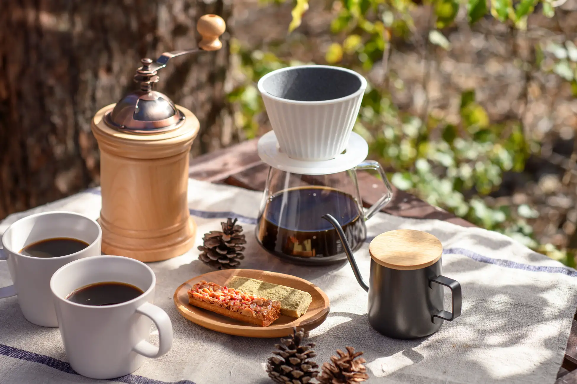 山の醍醐味の一つである、景色を見ながらコーヒーを味わう体験を宿泊者専用テラスにて楽しめます。必要な道具はすべて貸し出されるため、手ぶらで利用可能です。午後の日の傾く美しい日差しを受けながら、豆を挽いた後にコーヒーを淹れて香りと味わいを感じる贅沢な時間。コーヒー豆は、尾瀬の広大な景色を舌でも感じられるような広がりのある味わいのオリジナルブレンドです。焼き菓子とコーヒーを片手に、ゆっくりと旅を思い返したりと思い思いの山時間を過ごせます。