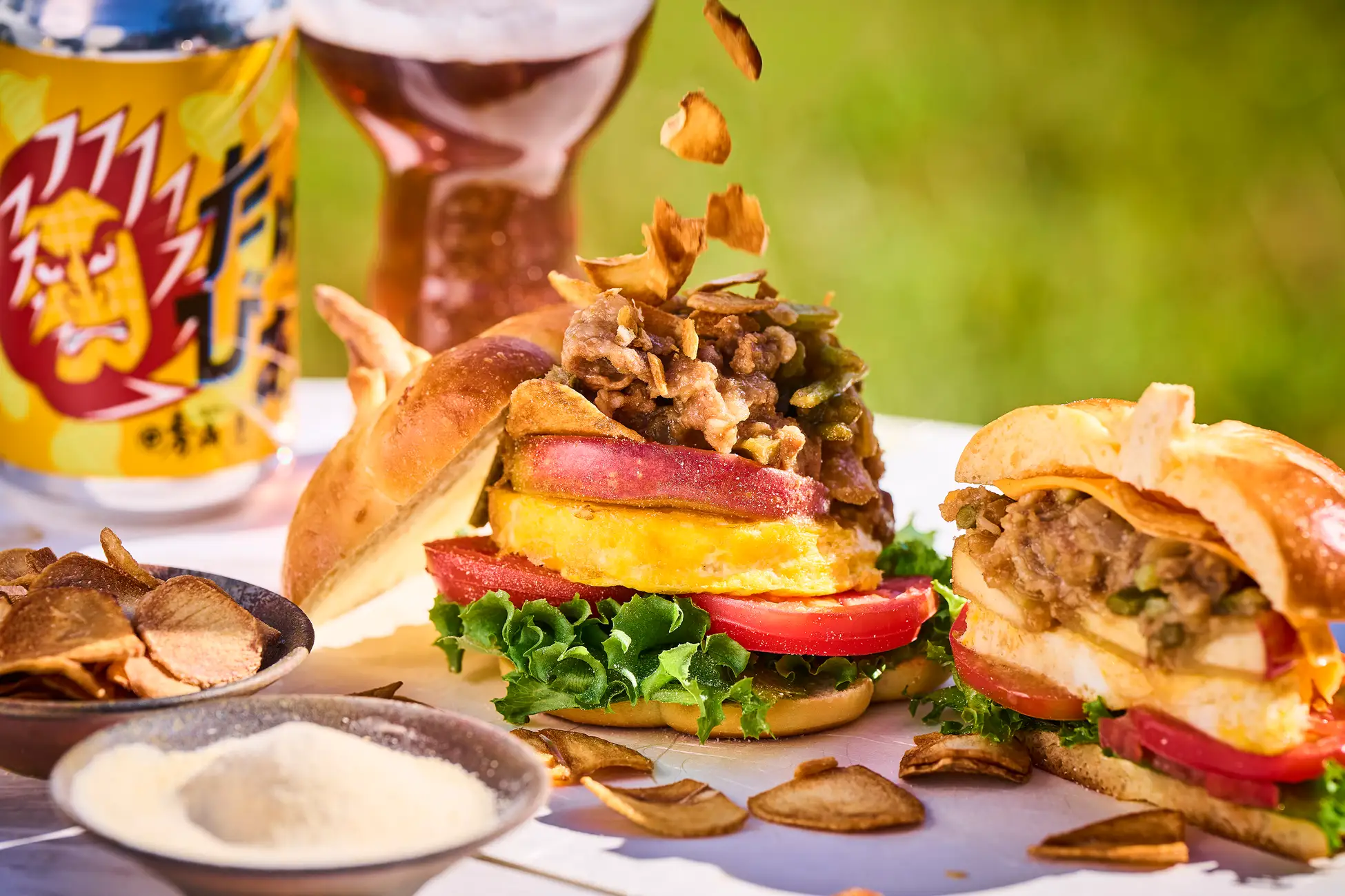 見た目と味わいでにんにくをとことん堪能する「にんにく増し増しバーガー」が新登場します。にんにくを練り込んだバンズに、りんごのピクルスとにんにくが効いたバラ焼き(*4)をサンド。トッピングはおろしにんにく・チップ・パウダーの3種類から選択できます。「ストップ!」と言うまで、スタッフがにんにくトッピングを惜しみなく盛り続けるため、自分好みのにんにく量に仕上げられるのが特徴です。オリジナルビールと一緒に味わうことで、にんにくの旨みを最大限に引き立てます。