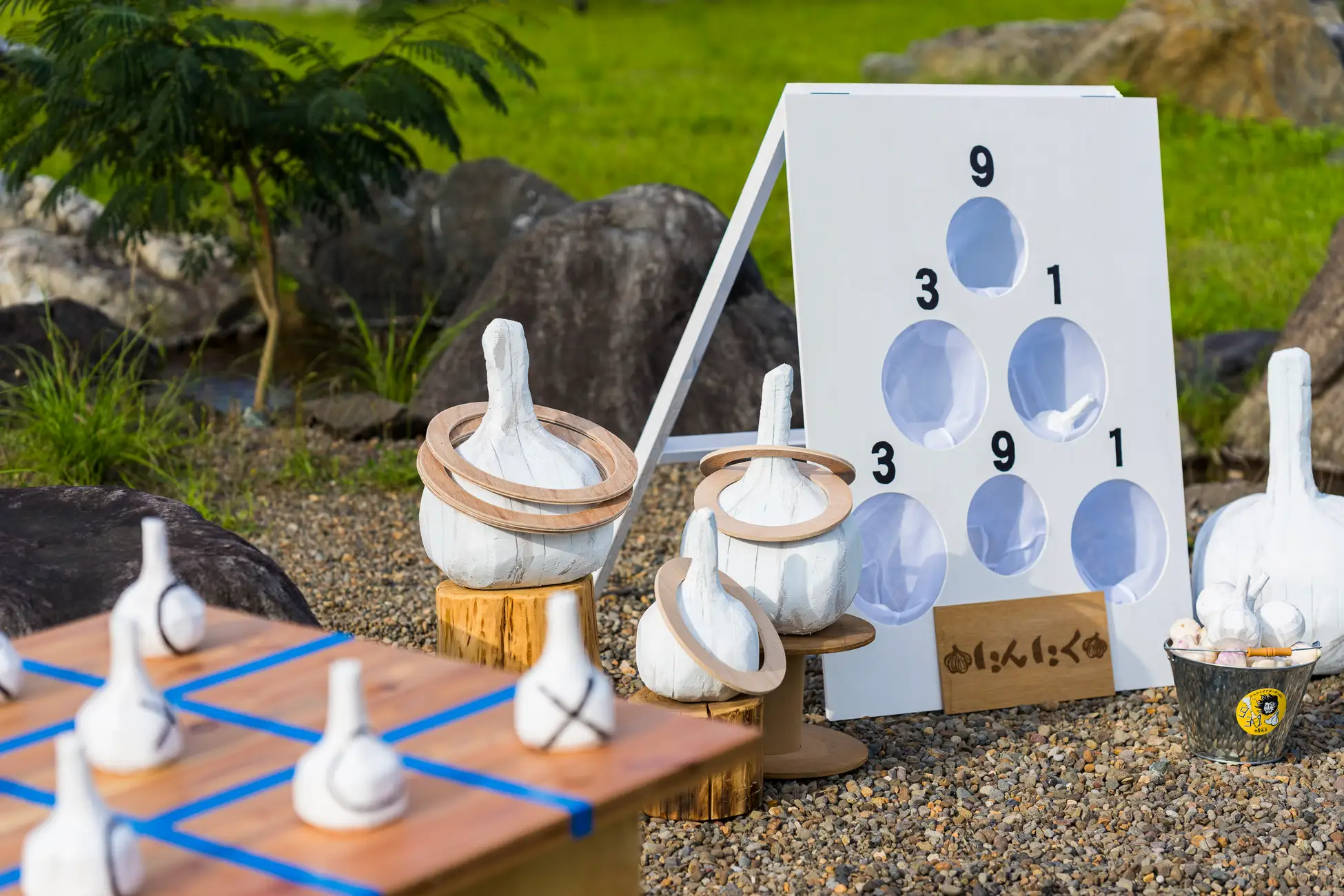 バーガーやビール、おつまみを味わう合間に、にんにくのユニークな形や色から着想したアナログゲームが楽しめます。黒にんにくと白にんにくの色の違いを活かした〇×ゲームや、茎の長さが異なるにんにくオブジェを的にした輪投げ、わずかに形が異なるにんにくの実で組み立てる立体パズルなどのゲームに挑戦し、さらに盛り上がります。