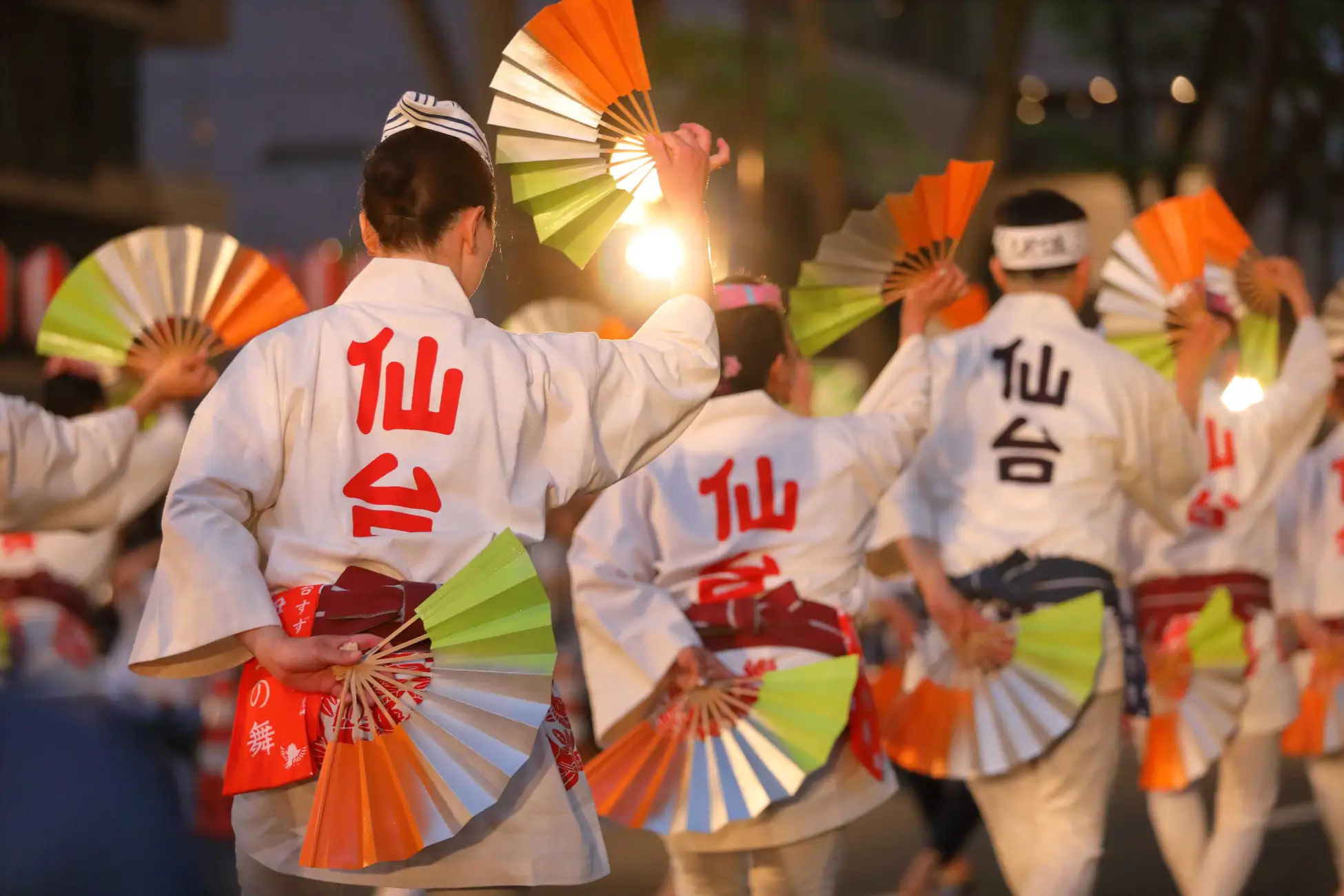 仙台すずめ踊りとは? 仙台城築城祝いの宴席で、石工たちが披露した即興の踊りがルーツ。扇子を手に、雀が餌をついばむように軽快に跳ねる躍動感が特徴です。数千人の市民が各グループ(祭連:まづら)ごとに個性を競い、お囃子に合わせて「ソレ!」と街中に声を響かせます。