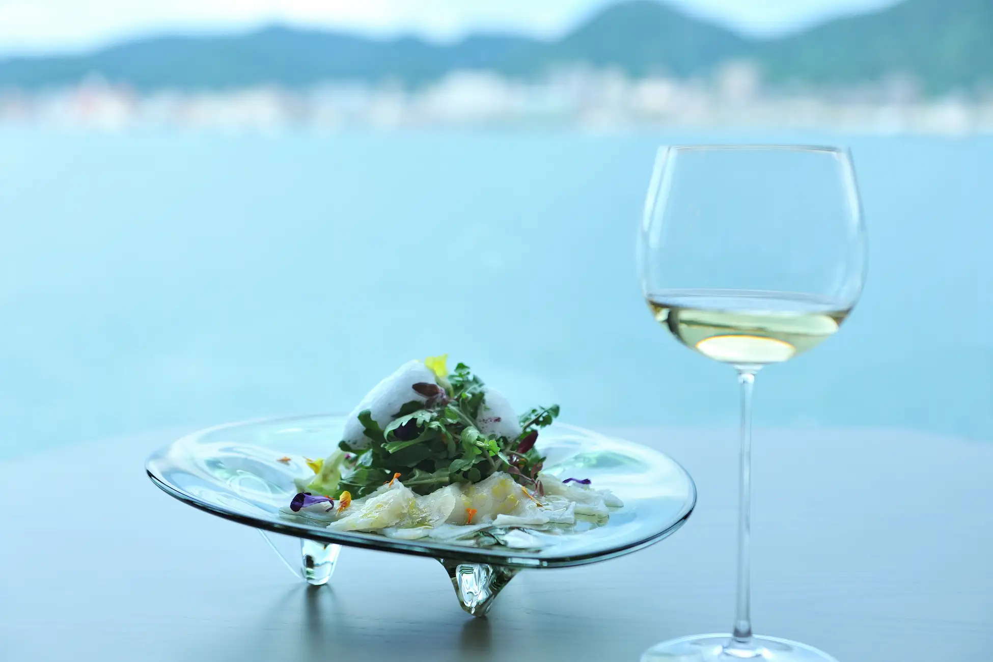 前菜は、ふぐをイタリア料理の定番カルパッチョに仕立て、仕上げに軽やかな柑橘の泡を添えた一皿です。3種のハーブを合わせることで、ふぐの旨味を爽やかな香りが引き立てます。