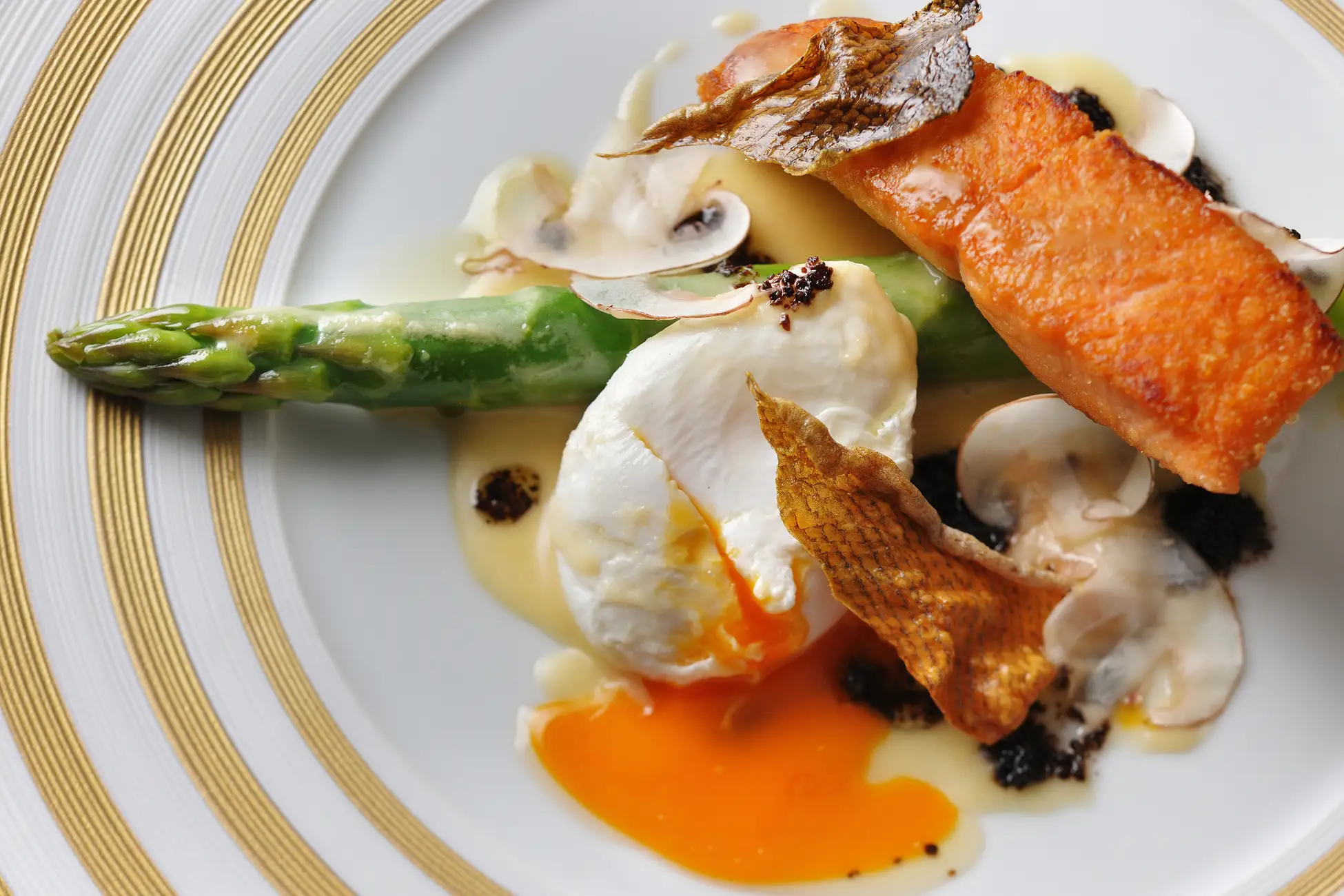 冷前菜は、魚介の旨み溢れる泡が料理全体をまとめ、春の訪れを華やかに感じさせる一皿です。アスパラガスやネマガリダケなど、北海道ならではの春野菜を魚介の旨みを凝縮した軽やかな泡が優しく包み込みます。