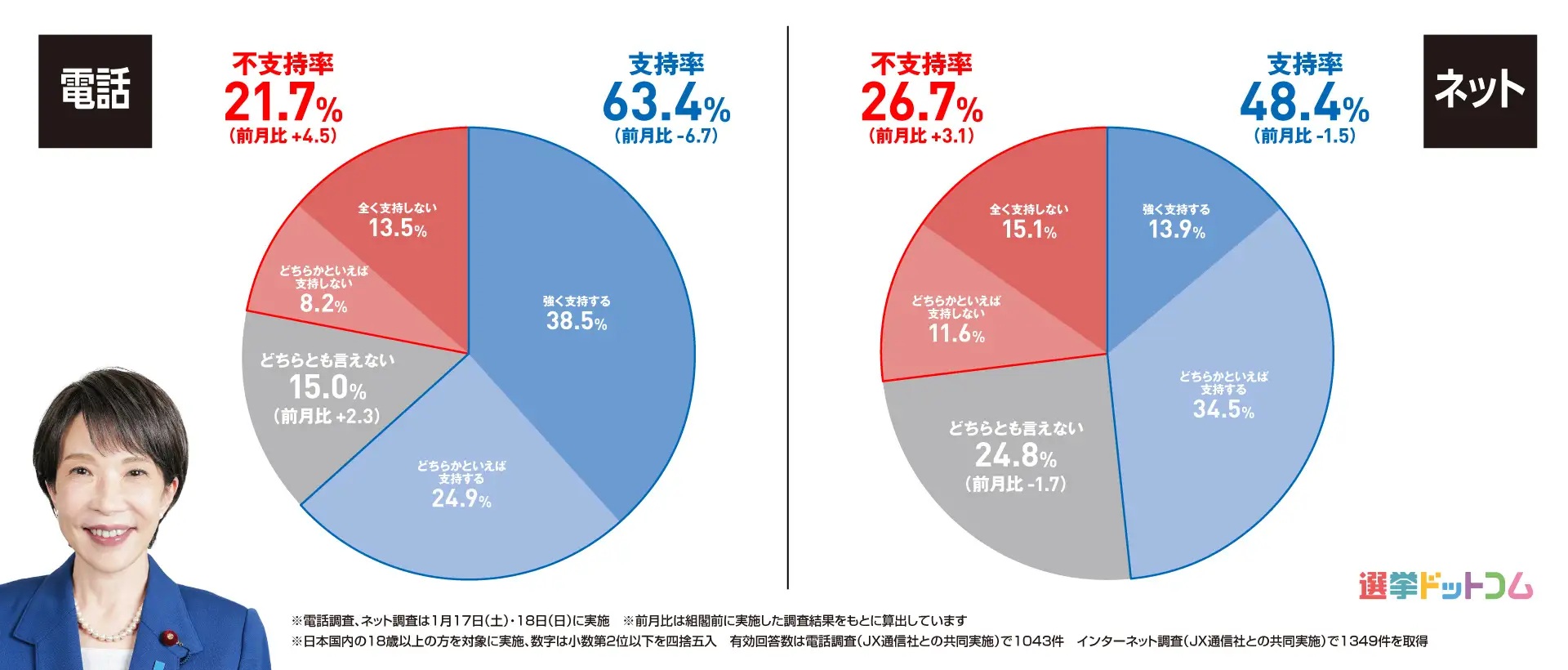 【調査概要】調査は令和8年1月17日(土)と18日(日)に実施。日本国内の18歳以上の方を調査対象とし、有効回答数は電話調査で1043件、インターネット調査で1349件を取得(いずれもJX通信社との共同実施)。各数値は小数第2位以下を四捨五入しています。