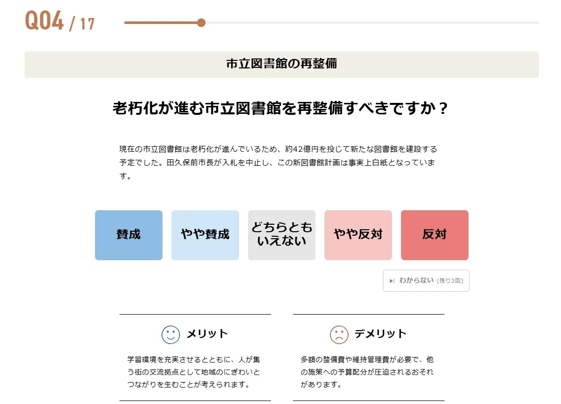今回の市長選の「争点」として挙げられている市立図書館の再整備や物価高対策など幅広い分野の設問になりますが、全ての質問に概要を説明する「解説文」と「メリット」「デメリット」を記載することで、利用者の判断材料をご提供します。