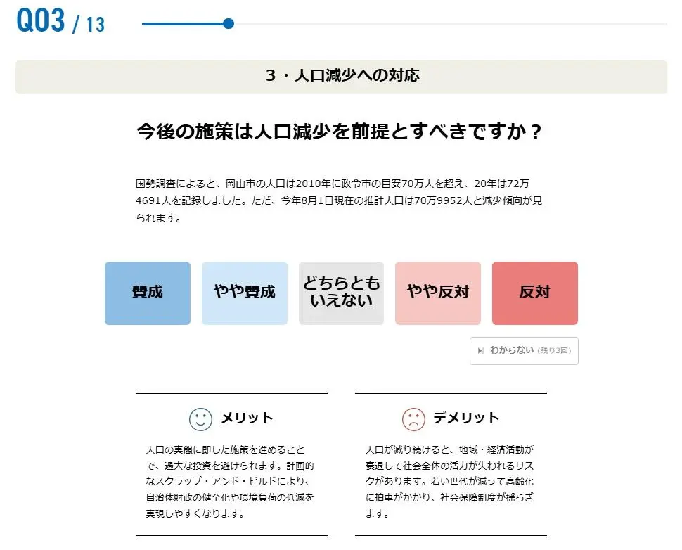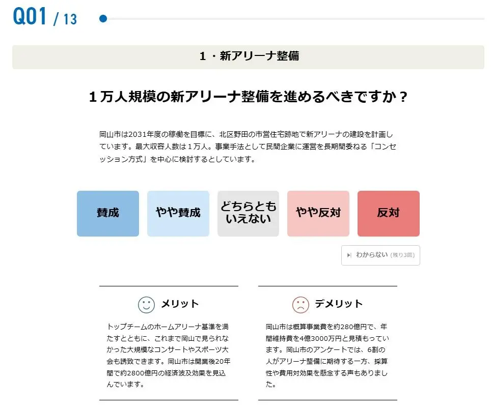 今回の市長選の「争点」として挙げられている新アリーナ整備や人口減少対策など幅広い分野の設問になりますが、全ての質問に概要を説明する「解説文」と「メリット」「デメリット」を記載することで、利用者の判断材料をご提供します。