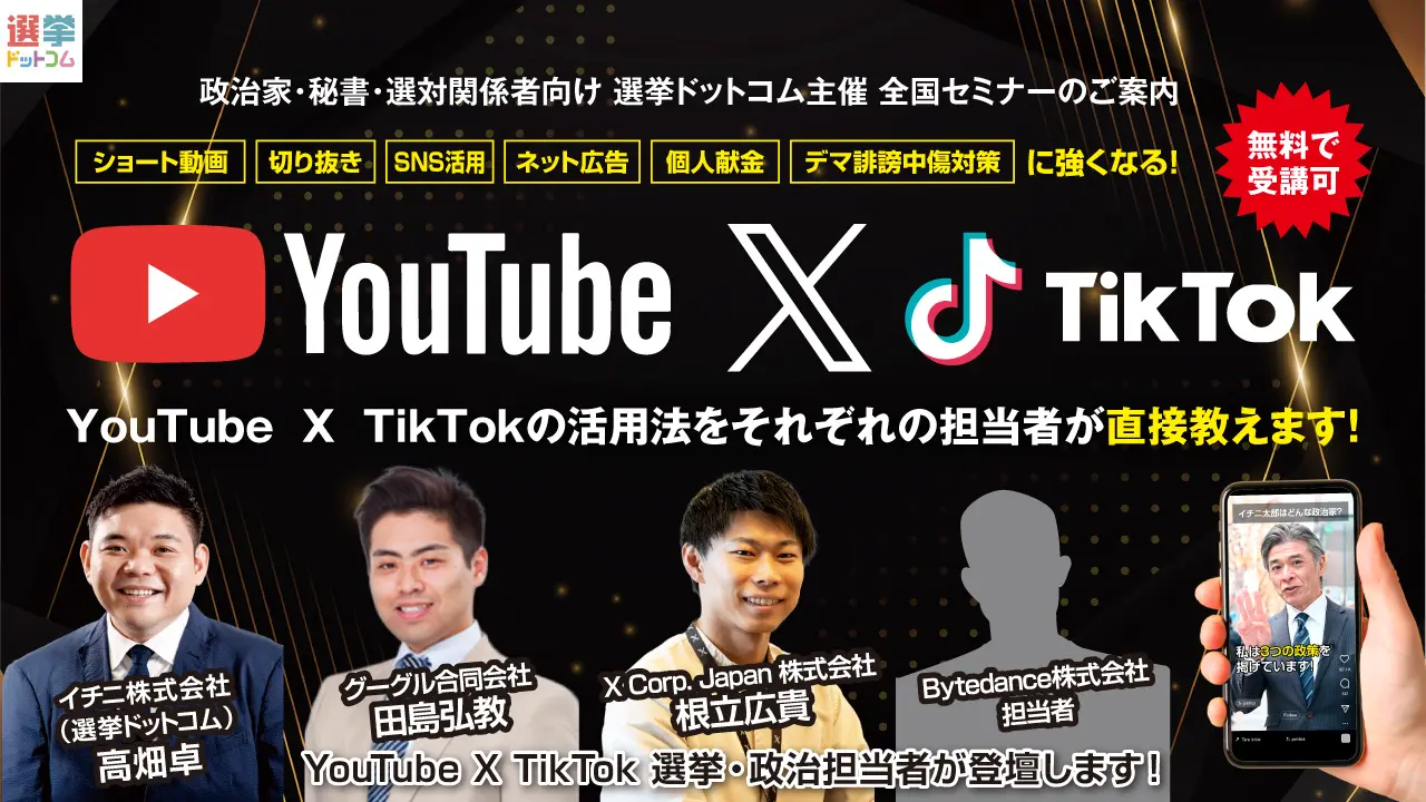【政治家・関係者向け】3大プラットフォームの担当者と「ネット選挙」を語り尽くす!2026年最新ネット選挙・SNS対策セミナーを2026年1月・2月に全国各地で現地開催!