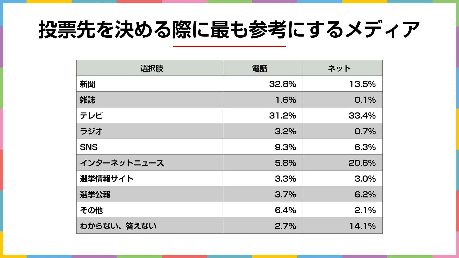 今回の調査では「あなたが今回の参院選で投票先を決める際、最も参考にするメディアは何ですか?」と尋ね、「新聞」「テレビ」「インターネットニュース」などの10択で回答してもらいました。