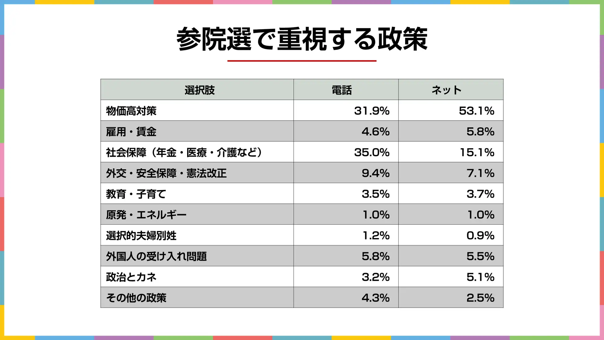 ネット調査では「物価高対策」が53.1%で最多、次点で「社会保障(年金・医療・介護など)」が15.1%となりました。
