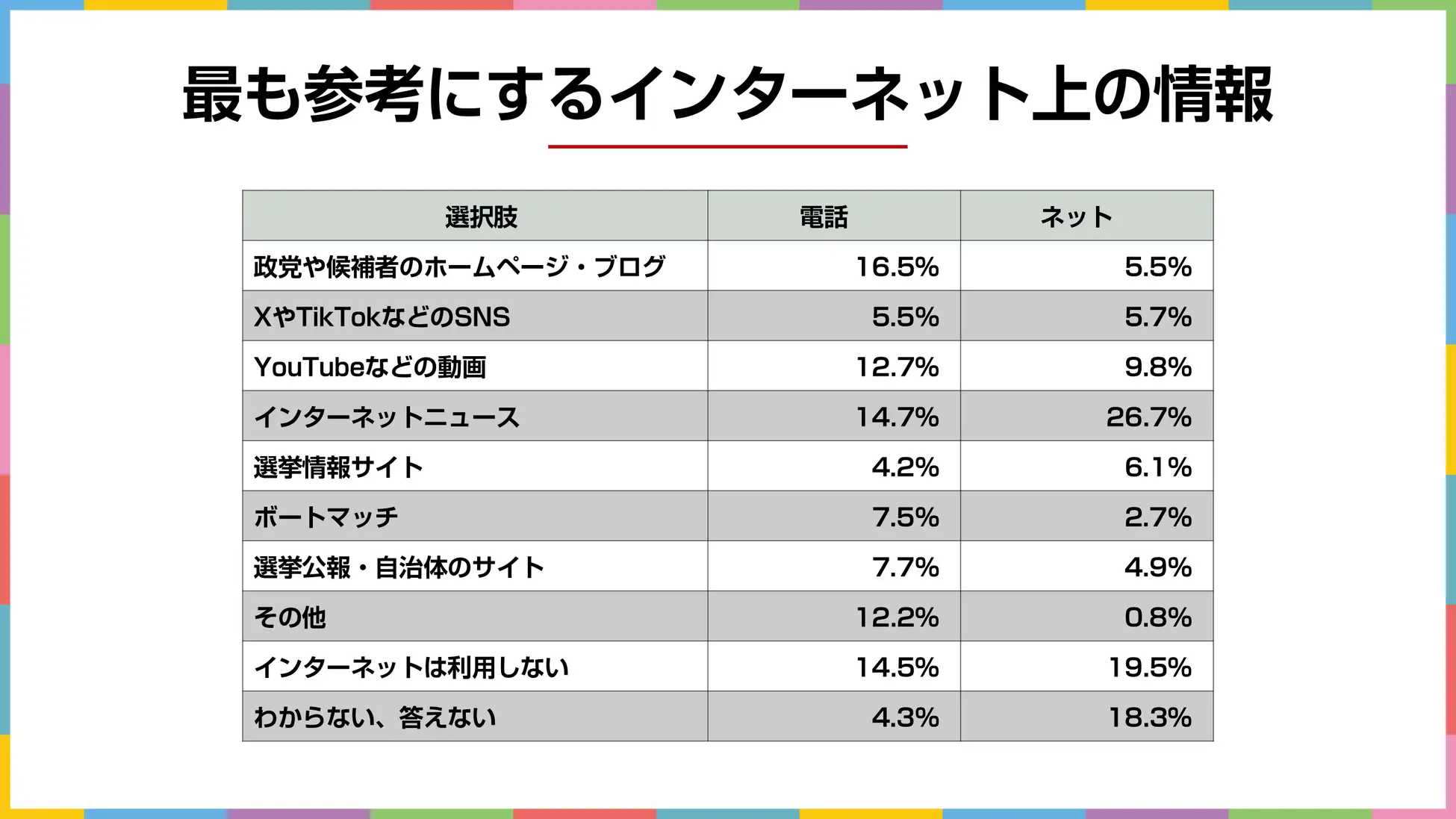 電話調査では「政党や候補者のホームページ・ブログ」が16.5%、「インターネットニュース」14.7%と多く、ネット調査では「インターネットニュース」が26.7%、「インターネットは利用しない」が19.5%となりました。