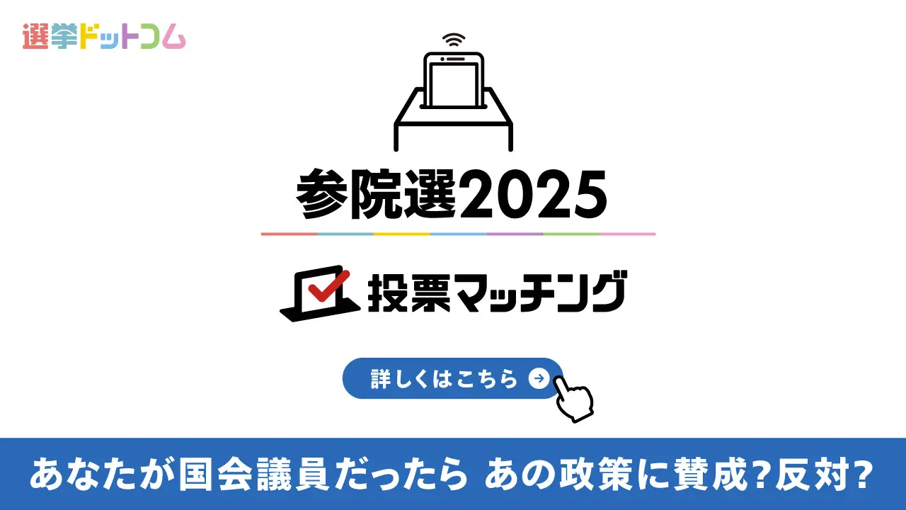 「第27回参議院議員選挙2025投票マッチング」では、7月3日公示・7月20日投開票の参議院の投票先を選ぶ目的で、私たちの生活に直結する政策に関する質問への賛否を回答していくとあなたの考えに近い政党とのマッチング度が測定できるサービスです。