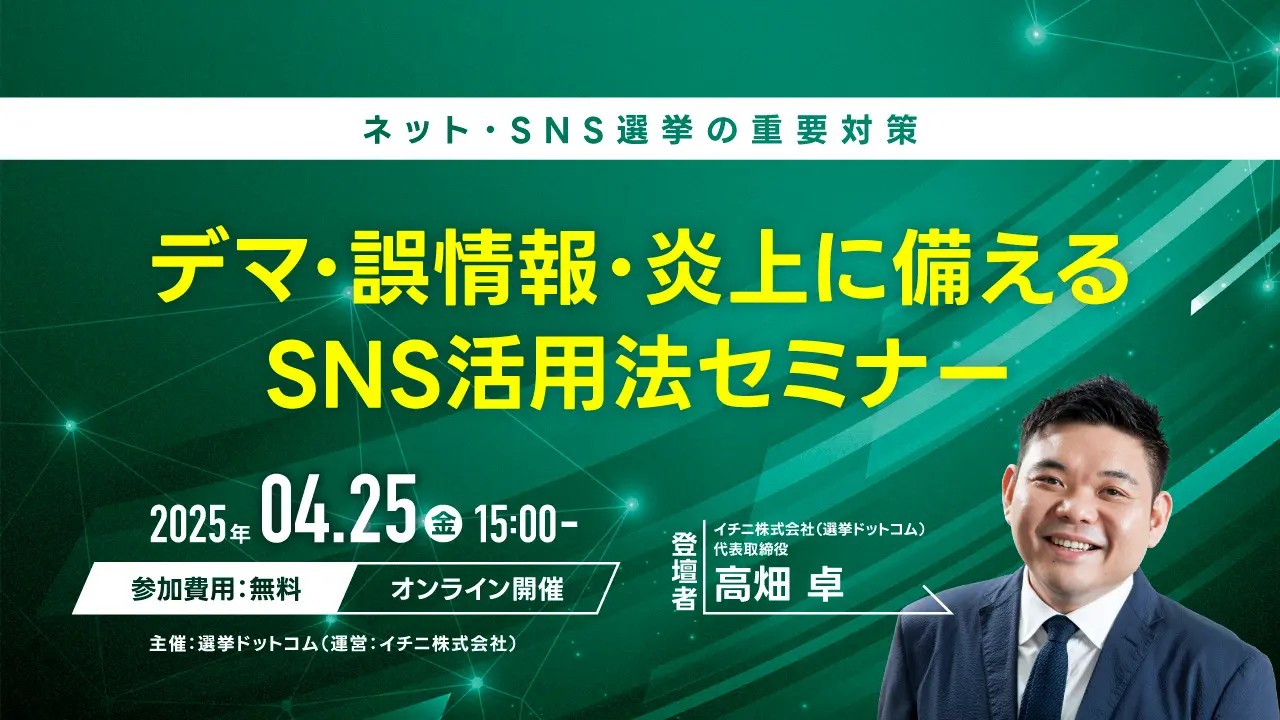 【政治家・関係者限定】ネット・SNS選挙の重要対策!選挙ドットコム主催「デマ・誤情報・炎上に備えるSNS活用法セミナー」無料オンラインセミナーを4/25(金)開催!