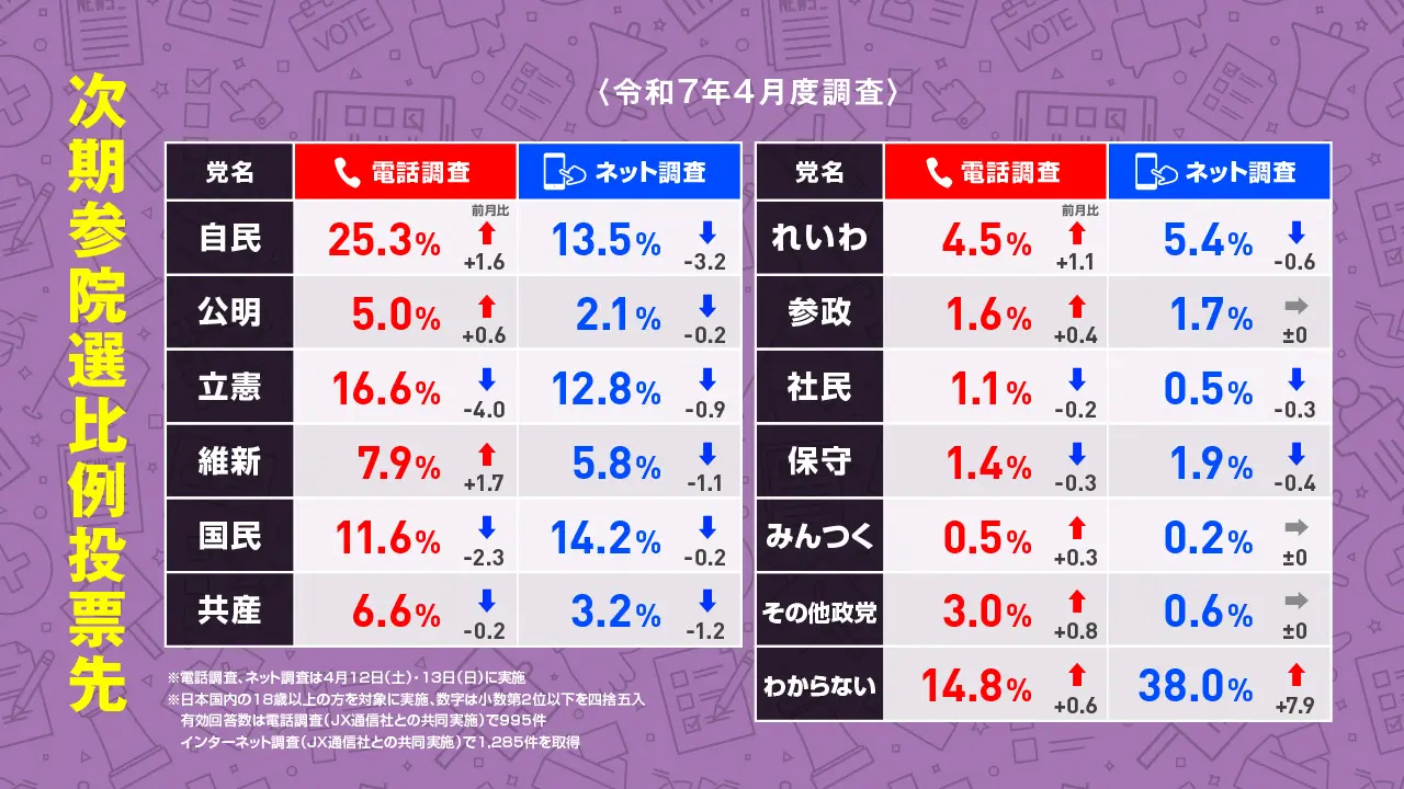 ネット調査では、国民民主党が自民党を上回ってトップに躍り出ました。ただ、いずれの政党も前月より減少か横ばいで、「わからない」が7.9ポイント増える結果となりました。
