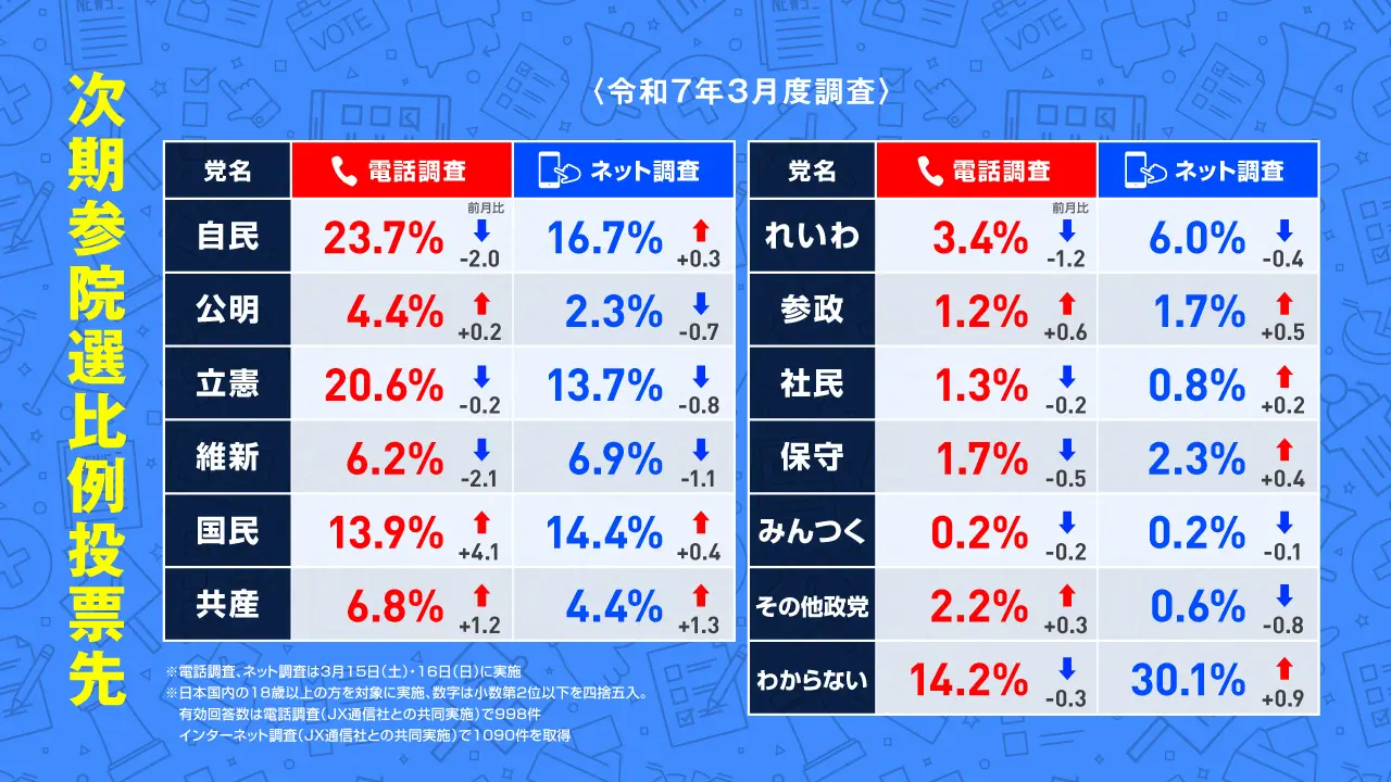 2025年3月15日・16日調査の次期参院選比例投票先について