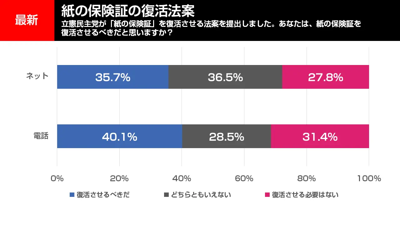 「立憲民主党が『紙の保険証』を復活させる法案を提出しました。あなたは、紙の保険証を復活させるべきだと思いますか?」と聞いた結果が上の図です。