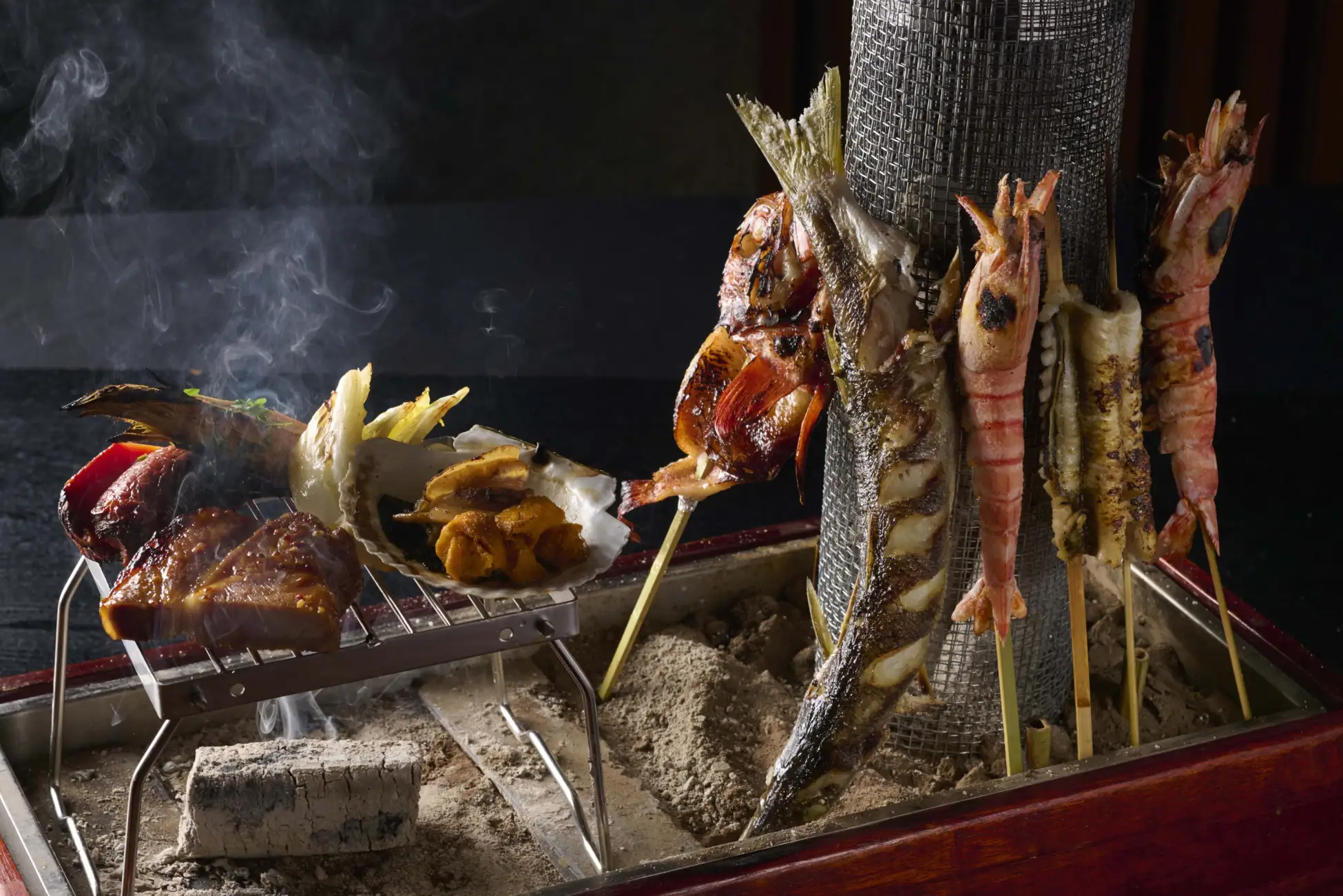 海鮮を味わう宿として自信を持ってお届けするのは、三浦半島の豊かな恵みと日本全国の旬の食材を織りなした日本料理。レストランの入り口には生簀(いけす)を備え、この土地の魚介や全国から届く旬の素材が揃います。繊細な味わいの小鉢料理や、出汁の香りが立つお椀物、新鮮なお造りなど海鮮を中心としたコース料理です。メイン料理として魚や海老の素材そのものを味わう炭火焼き料理をご用意。炭火でじっくりと焼くことで食材には香ばしい風味と深みが与えられ、格別な旨味を愉しめます。香りや音も特別な演出となり、「ふふ 城ヶ島」でしか味わえない、五感で愉しむ日本料理をご堪能いただけます。1階のレストランは、プライバシーを保ちながらも海を見渡す開放的なしつらえとなっています。刻々と移ろう海と空の穏やかな情景を眺めながら、ゆったりとしたお時間をお過ごしください。