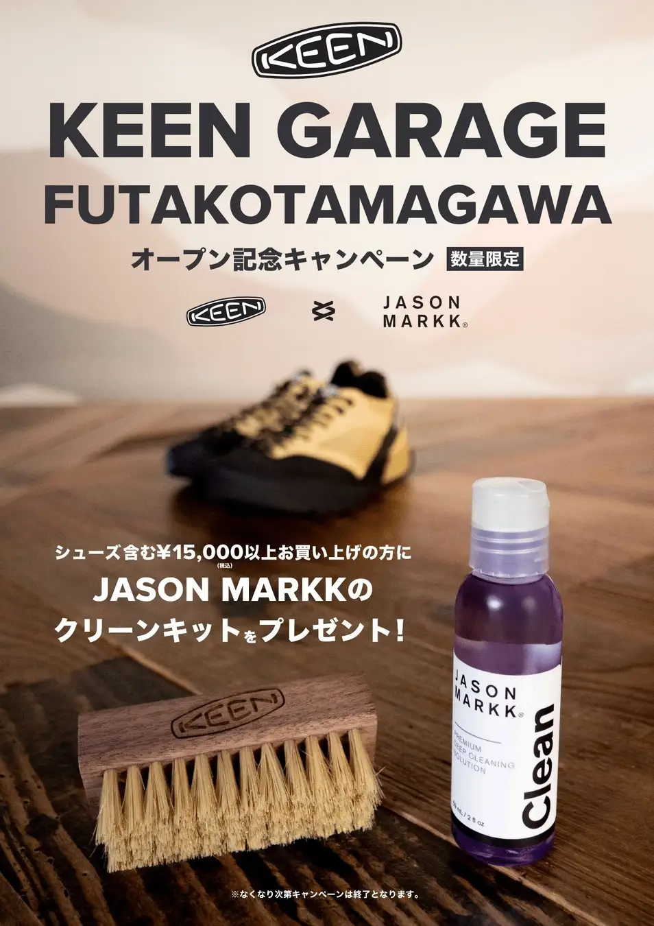 KEEN GARAGE FUTAKOTAMAGAWAのオープンを記念して、シューズを含む¥15,000(税込)以上お買い上げのお客様に、LA発のシューケアブランド「JASON MARKK(ジェイソンマーク)」のクリーンキットをプレゼントします。