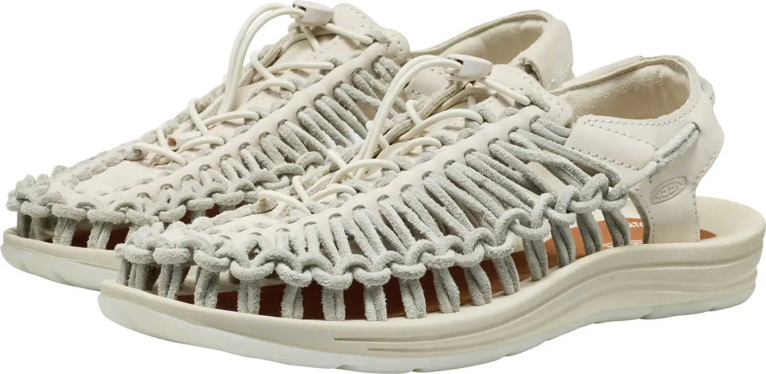 KEEN のオリジナル・オープンエアスニーカーUNEEKに使われるレザーコードは、ほどよい凹凸でさりげない質感を与え、朝もやを思わせるやわらかなトーンを演出します。マットな質感のコードは、きめ細かく起毛した上質なヌバックアッパーと美しく調和します。なお、KEENではすべてのレザーを環境認証団体LWG(レザーワーキンググループ)のゴールド認証を受けたタンナーから調達しています。