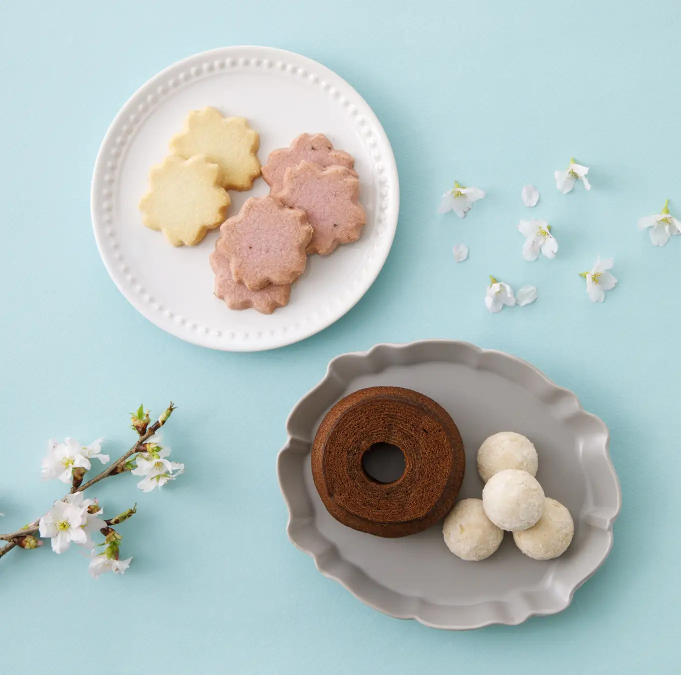 さくらの花をかたどったクッキーは、春らしさ満点の一品。ほんのりさくらが香るクッキーに加え、ホロホロとした口当たりが特長のポルボローネ、チョコレート味のバウムクーヘンなど、3種の焼菓子を詰め合わせました。
