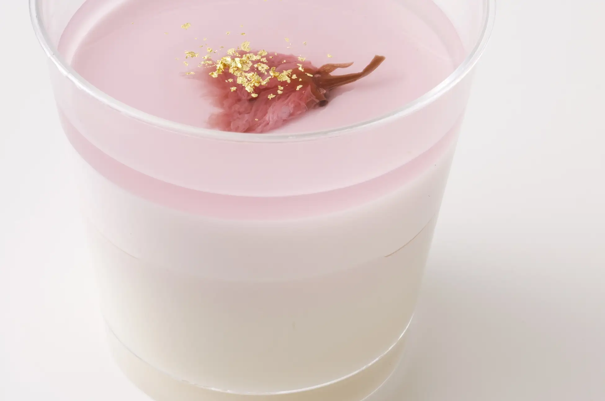 上層には、金粉をあしらった桜風味のゼリー。中に忍ばせた桜の塩漬けが、ほどよい塩味で全体の甘さを引き立てます。