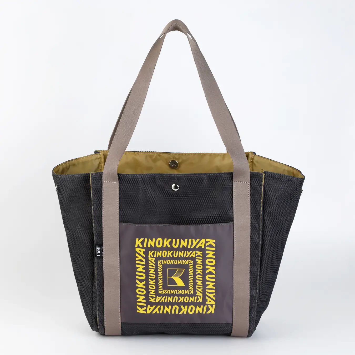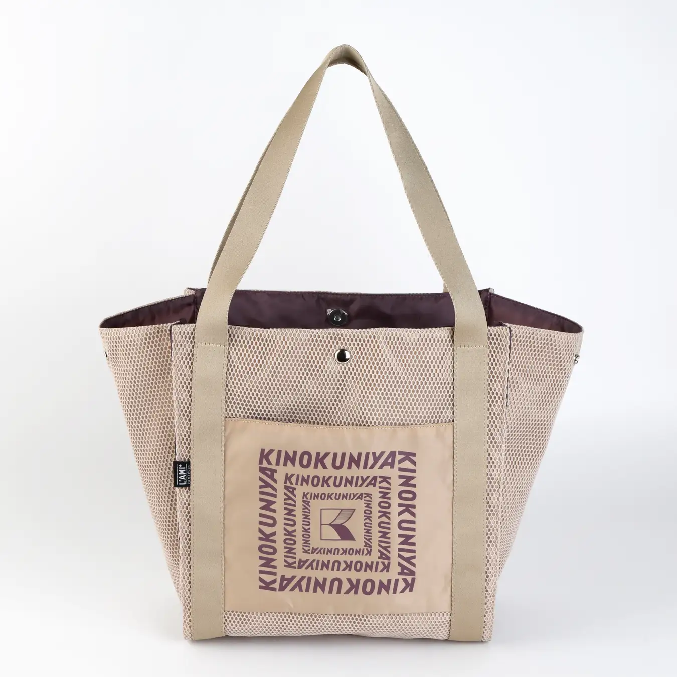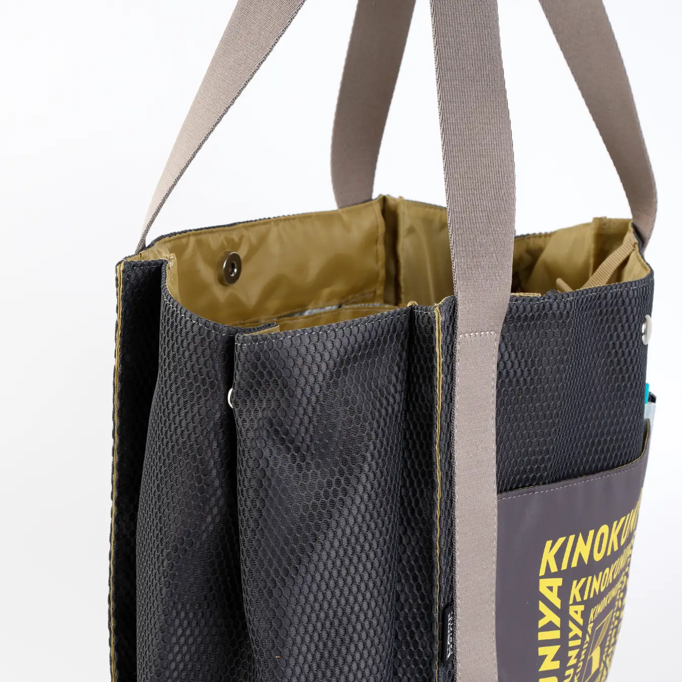上品なツヤ感のある生地とメッシュ素材を組み合わせ、適度なハリを持たせた設計。サイドのスナップボタンでまち調整も可能です。コンパクトに持ち運びすることもできます。