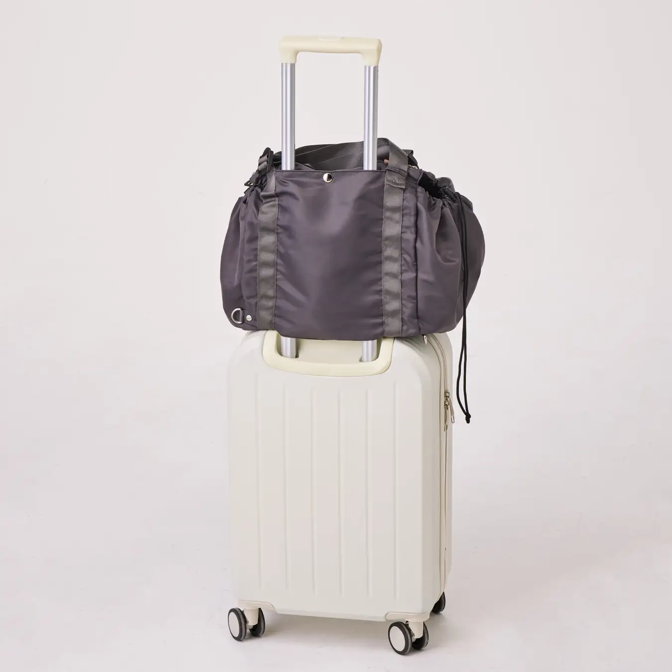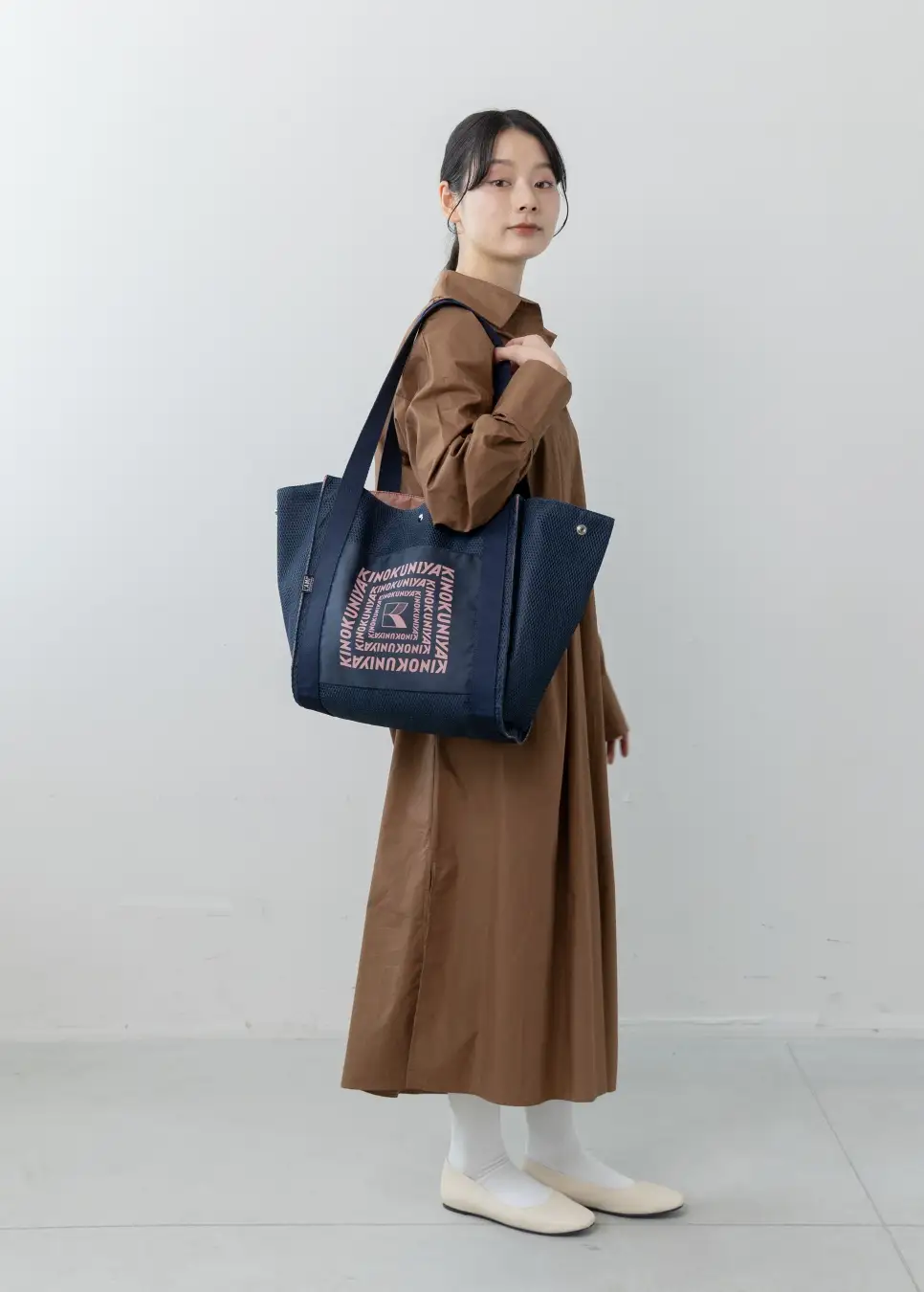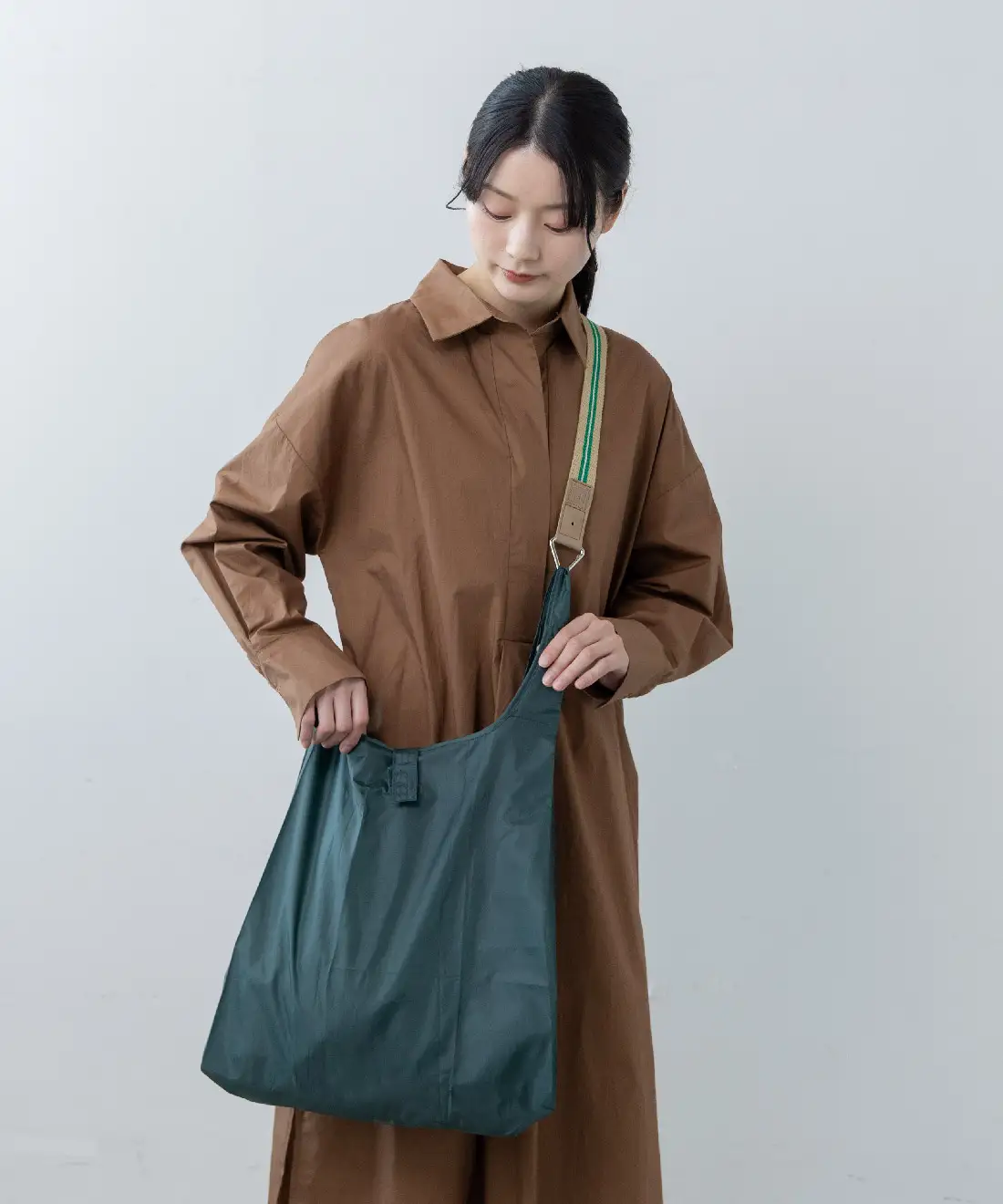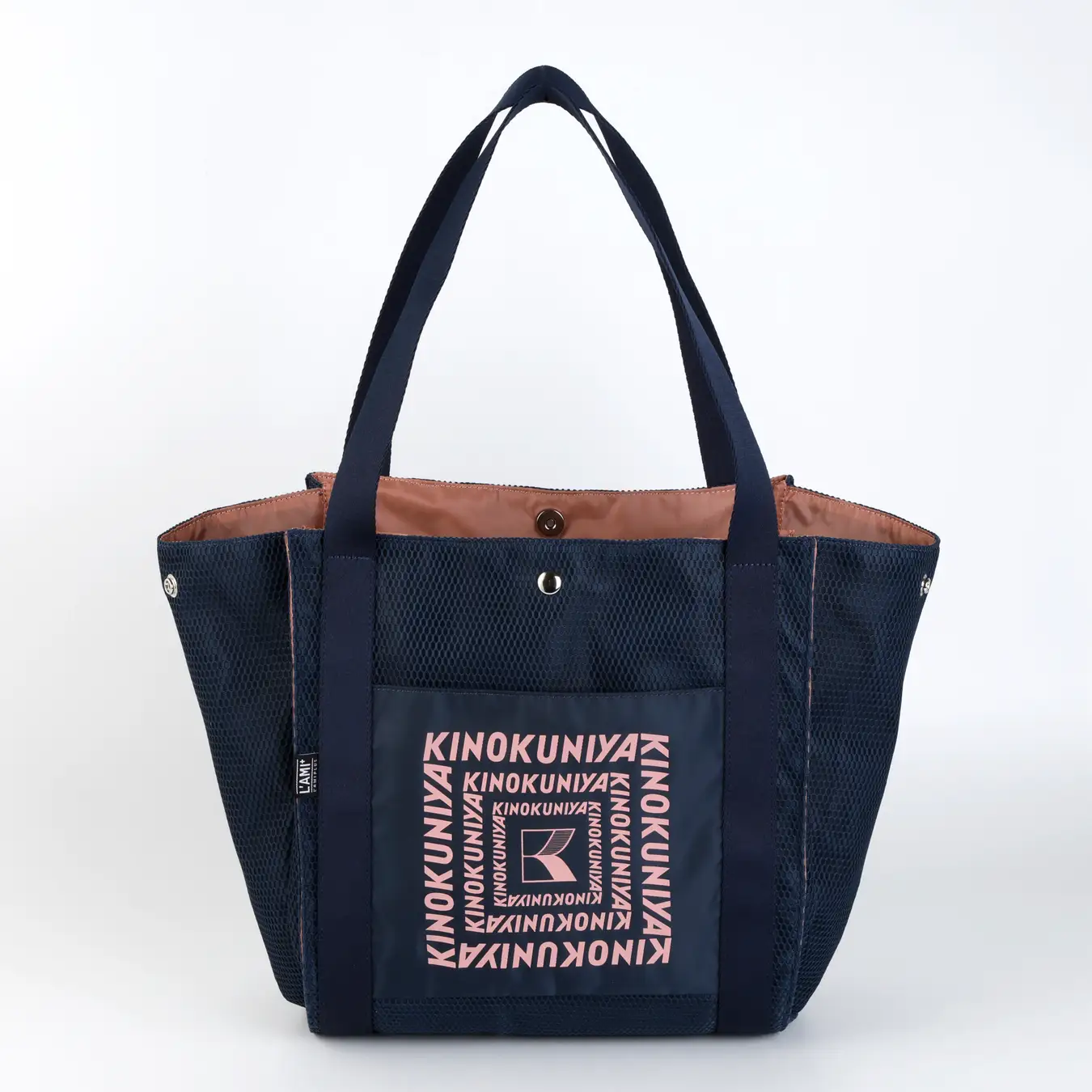 上品なツヤ感のある生地とメッシュ素材を組み合わせ、適度なハリを持たせた設計。サイドのスナップボタンでまち調整も可能です。コンパクトに持ち運びすることもできます。