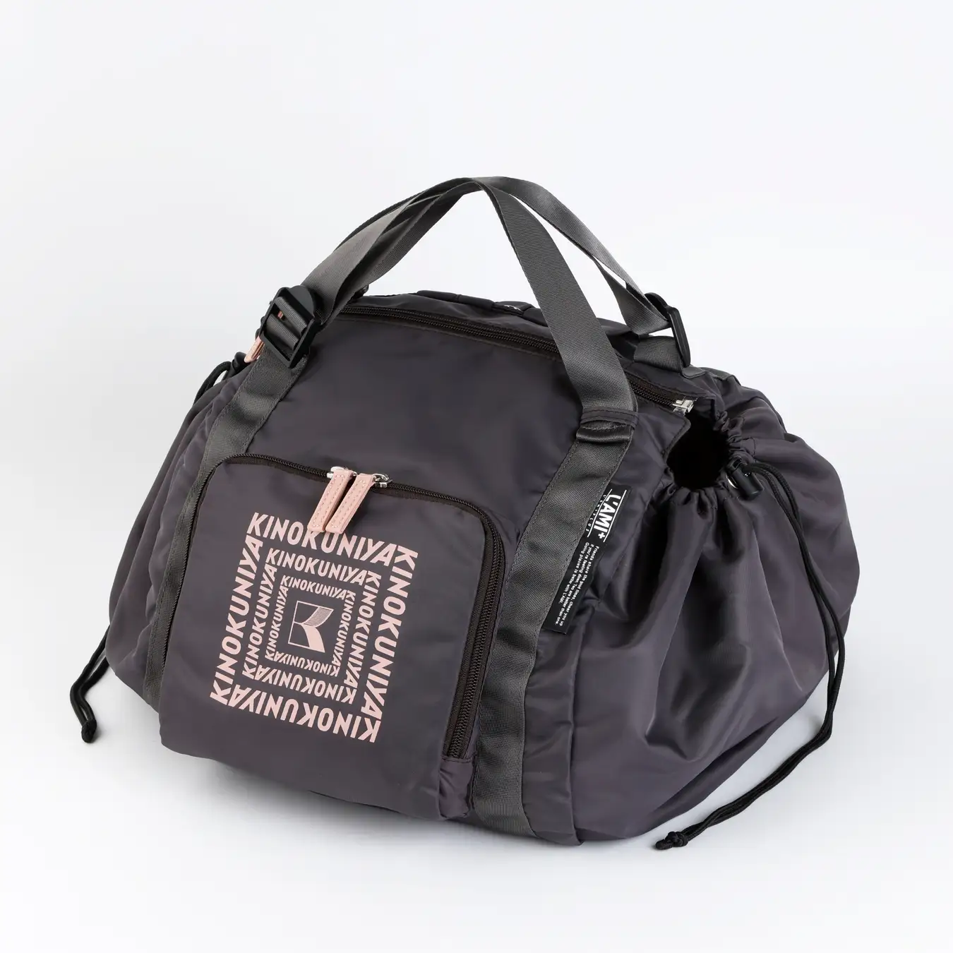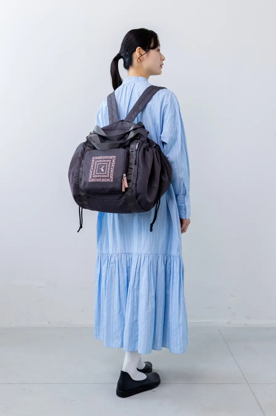 人気のレジカゴリュックにポケッタブル仕様のコラボモデルが登場しました。ブラックベリーを思わせる深みのあるカラーに、紀ノ国屋のピンクロゴがアクセント。リュック・肩掛け・手持ちの3WAYで、日常の買い物から旅行まで幅広く活躍します。