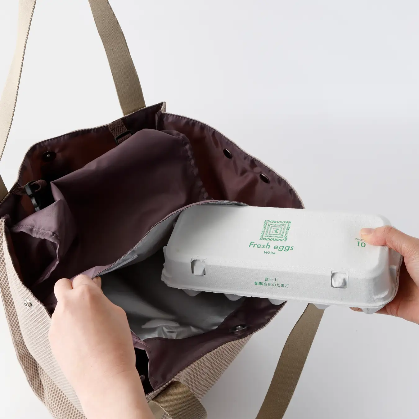 バックルを留めるとつりポケットがハンモック状になり、卵や果物など傷つけたくない食材をやさしく持ち帰れます。つりポケットの内側はアルミ蒸着仕様で、あたたかいものや冷たいものを分けて運ぶのにも重宝します。口もとは面ファスナー留めで安心。中身の目隠しとしても使えます。