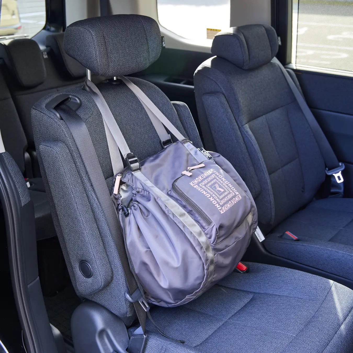 さらに、ファスナーを閉じずに、クルマの前後ヘッドレストに掛ければ“ハンモック仕様”に。車内で荷物が転がるのを防ぎ、まとめて収納できます。