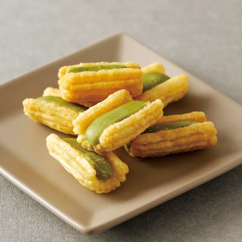 京都老舗・放香堂の宇治抹茶を使用した揚げおかき。ほろ苦さとあんこの甘さが調和した、つい手が止まらなくなる味わいです。