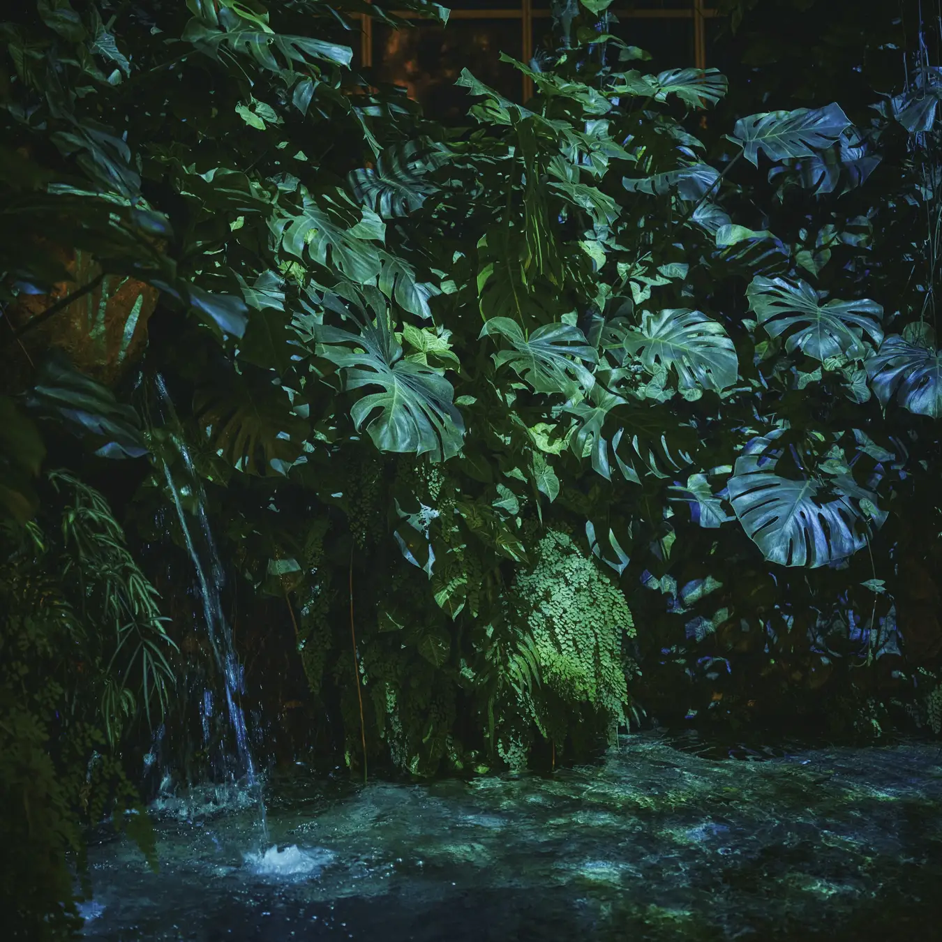 ガラス張りの天井から、イルミネーションが降り注ぐ幻想的空間が登場します