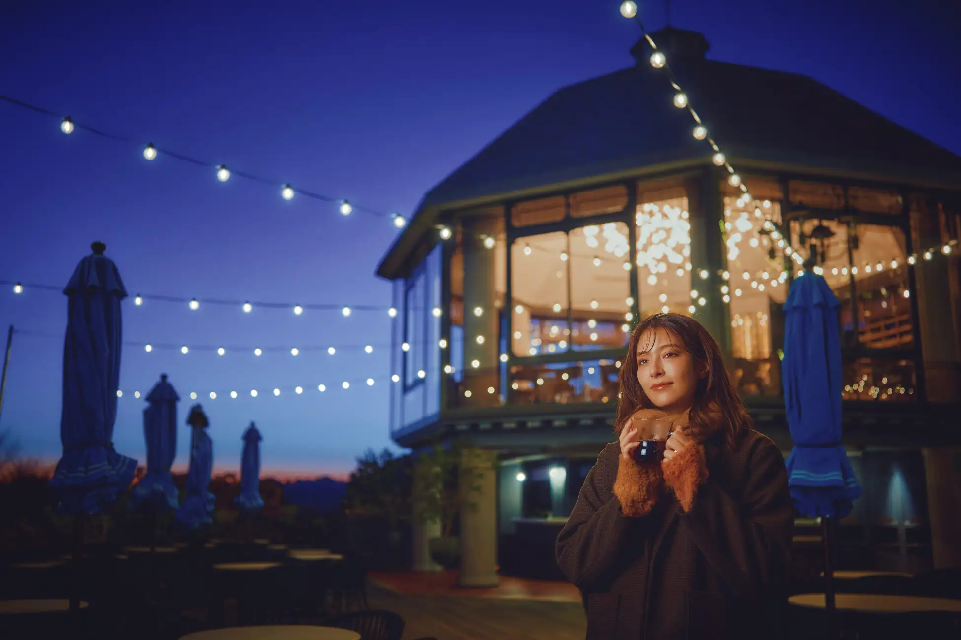広い空、豊かな自然、開放感溢れるザ・ヴェランダ神戸。心地よい風を感じながら絶景を眺められる1Fテラスは、期間中の金曜、土曜、日曜、祝日、12/15(月)~12/25(木)の間は、ナイター営業を実施。ナイター限定のメニュー「特製クリームシチュー」をはじめ「特製グリューワイン」、ハーブティーなど心と体をほっこりと温めてくれるフードやドリンクなどをご用意しています。煌めく夜景と輝くイルミネーション空間で特別なひとときをお過ごしください