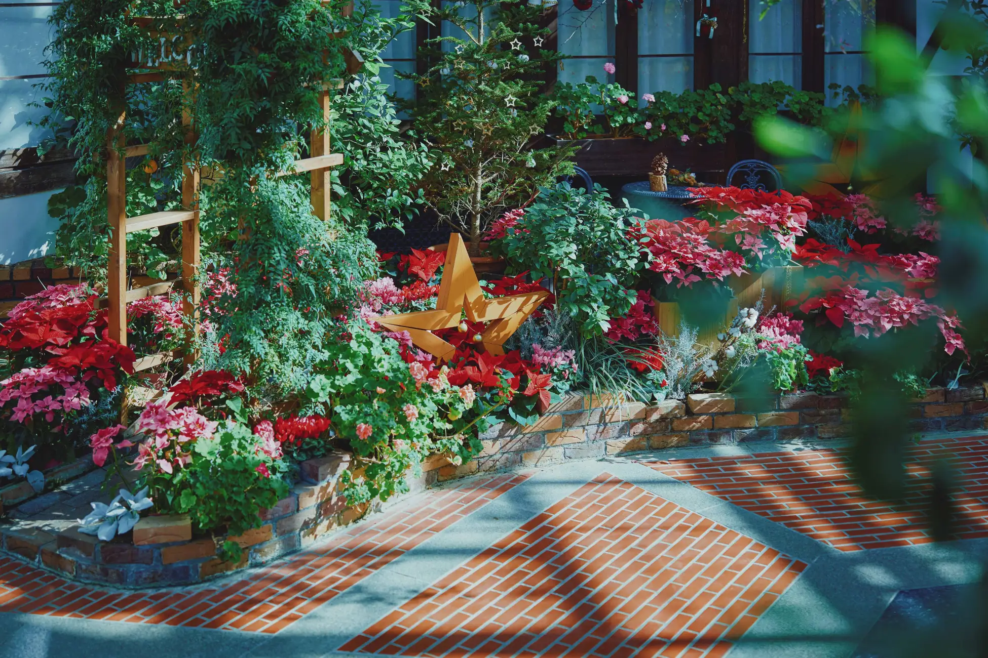 温かみのある木製の星のモニュメントや植物でキラキラとした空間を演出。ポインセチアを中心に、プリンセチアやシクラメン、ガーデンシクラメン、ゼラニウム、エレモフィア、モミなどクリスマスカラーの植物で装飾された室内で楽しめる人気のフォトスポットです。天井からは、トラディスカンティアのハンギングが降り注ぎ、大きな星のモニュメントとともに温かくお迎えします
