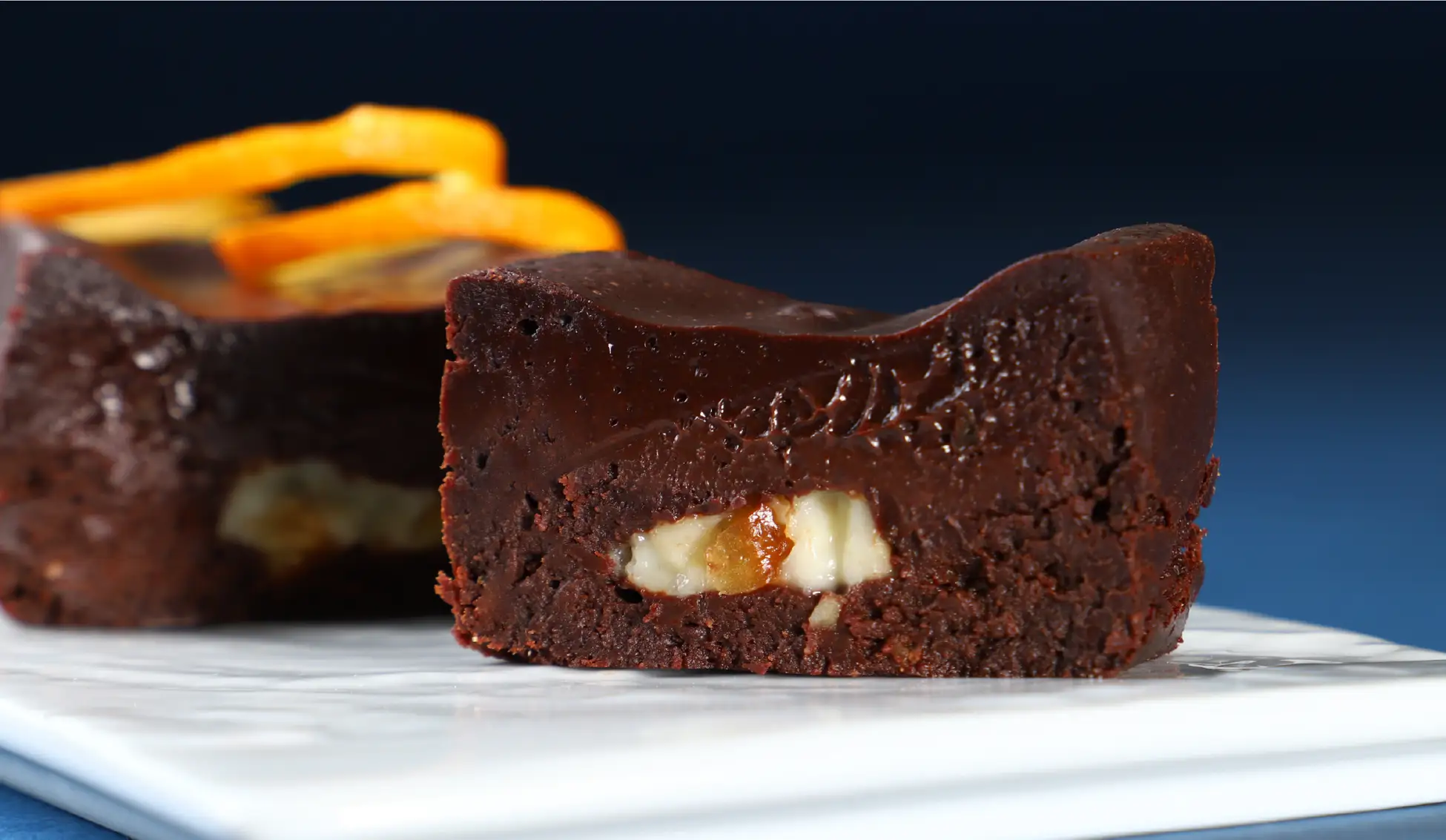 爽やかな酸味の決め手となるオレンジピールは、あえて「チーズ」部分だけではなく「チョコレート生地」全体に練り込むよう調整しました。これにより、どこを食べてもカカオのビターな風味と共にオレンジの華やかな香りが広がります。