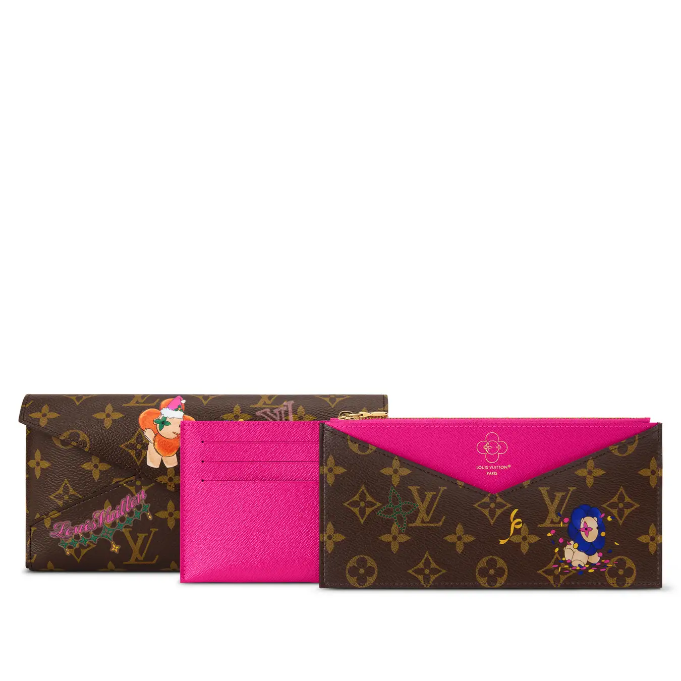 遊び心溢れる「ポルトフォイユ·サラ」が登場。ルイ·ヴィトンのマスコットのイラストや「ヴィヴィエンヌ」を模ったスナップボタンが彩りを添えるプレイフルなデザインです。メゾンを象徴するモノグラム·キャンバスを使用し、上質なレザーでトリミングとライニングを施しました。内装には、紙幣やコイン、カードを収納できる複数のコンパートメントを備えています。