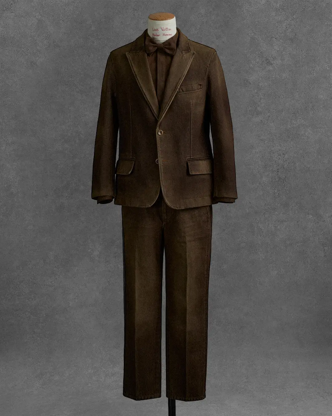 ジェレミー·ストロングが着用したカスタムメイドウエアには、2026春夏メンズ·コレクションのショーのために独自開発された、コーヒービーンカラーの認証デニムを使用しています。ヴィンテージ感を出すために特別なウォッシュ加工が施され、コーヒービーンの陰影を表現するためのハンドペイント工程を取り入れています。このウエアのウォッシュ加工には約24時間、仕立て工程には約25時間もの時間を要しました。