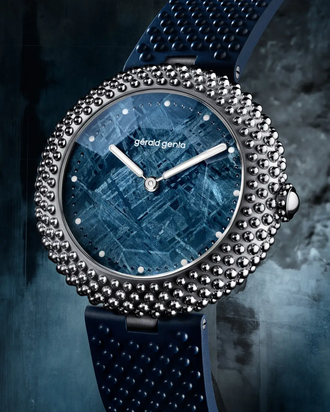 一見すると、サンドブラスト加工を施したグレード5チタニウム製の壮麗なラウンド型ケースを持つ「ジェンティッシマ ウルサン 41」のデザインは、実は、見た目以上に奥深さがあります。内側の輪郭は微かに八角形を帯びており、鋭い観察眼を持つ者のみが発見できる、デザインの独創性を物語っています。軽量でありながら極めて頑丈なこのマット仕上げのケースには、234個の輝くホワイトゴールドビーズが精密に配置され、それはまるで手首に装着するミニチュア彫刻のように、形状と素材が織りなす壮観な幾何学的相互作用を生み出します。「ジェンティッシマ ウルサン」コレクション初となるこのユニークなケースが、宇宙の断片から彫り出された文字盤である、ブルーまたはグリーンのメテオライトの薄い層を包み込んでいます。