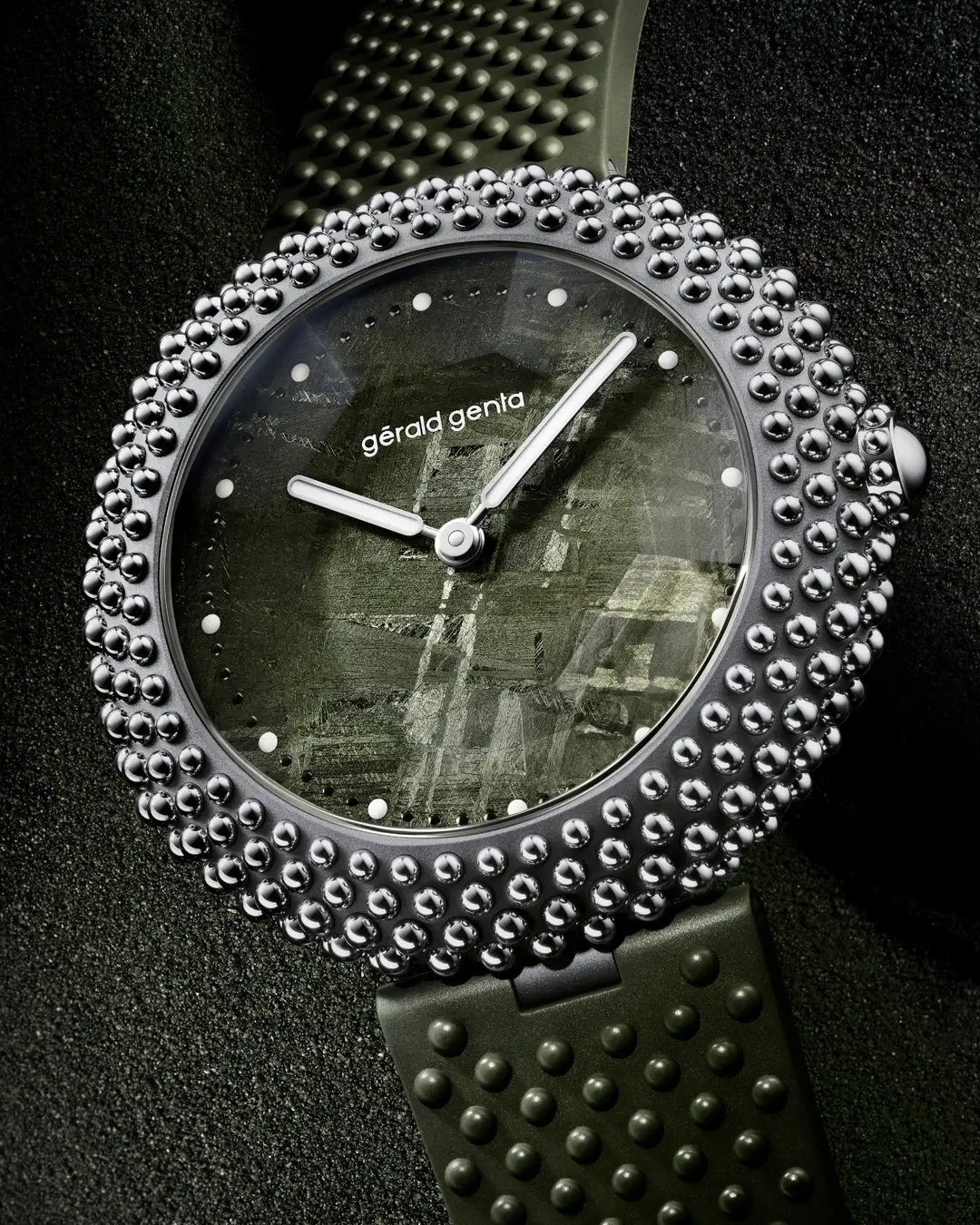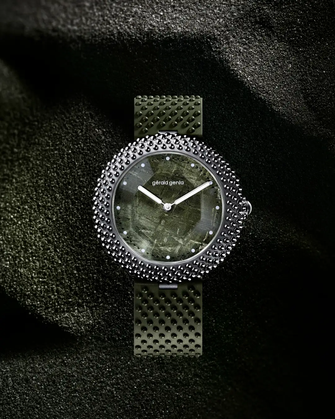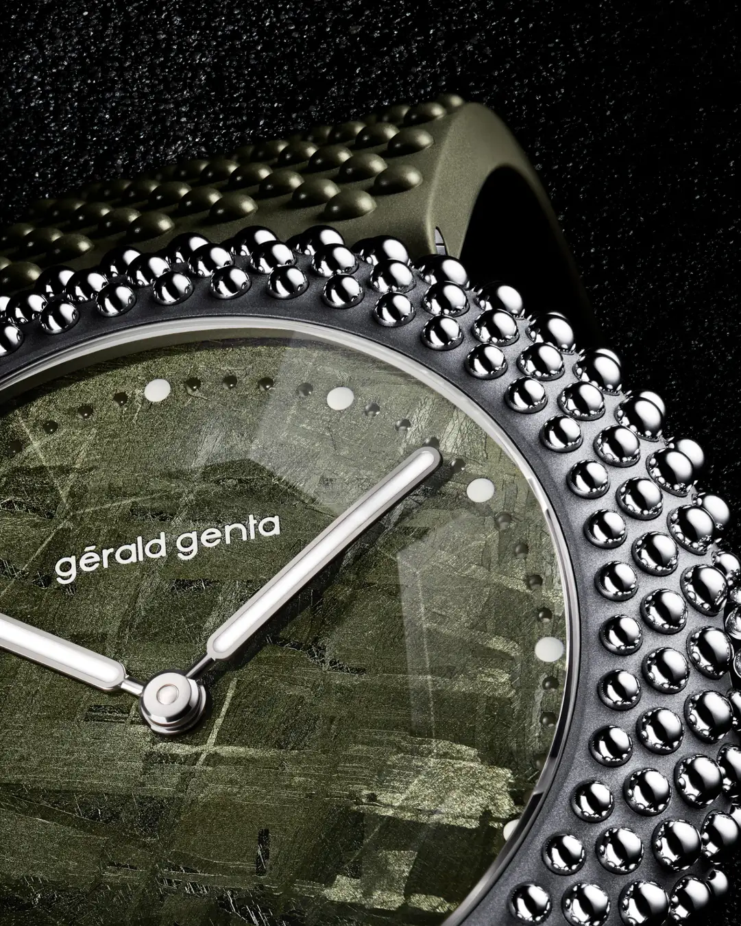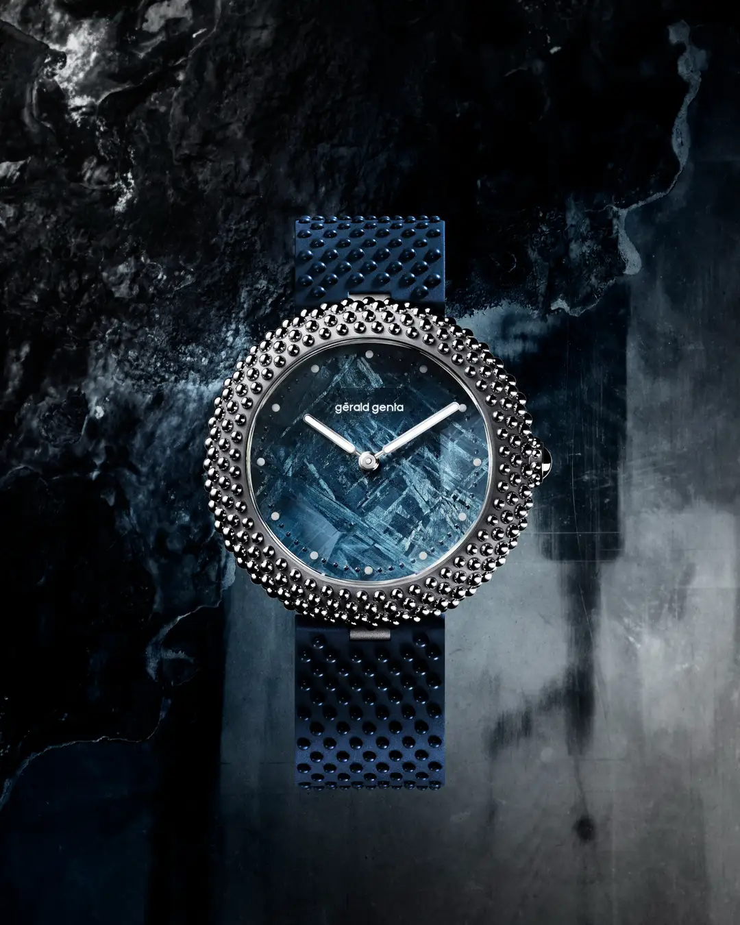 新作「ジェンティッシマ ウルサン 41」は、単なる大型モデルではなく、型にはまらない精神への大胆な宣言。メテオライトダイアルが放つグリーンあるいはブルーの深い色彩は、伝統的なハイウォッチメイキングにありがちな控えめな構造を打ち破っており、その有機的な美学は型破りな思考の重要性と、ジェンタ氏の稀少なプレシャスマテリアルへの愛着を物語っています。また、メテオライトの薄い切片天然の結晶は1枚1枚が異なる構造を持ち、各ウォッチが稀有な1点物の作品であることを示唆しています。「メテオライトは石ではないものの、独特な鉱物起源と美しい複雑な構造を持っている」と語るマチュー·エジ。「天然素材本来のよさを生かしたいと考え、また、ウォッチに時代を超えた、よりスポーティでシックな特徴を与えたいと思い、明るい色合いではなく暗い色合いを文字盤に選んだ」。