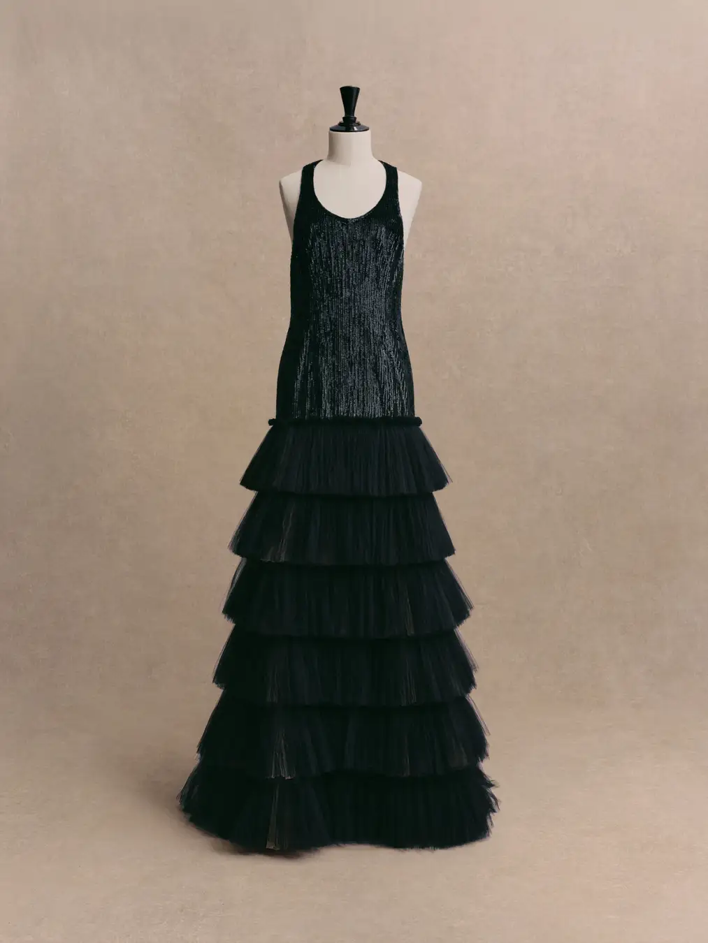 ローズ·バーンが着用したドレスは、体にフィットするボディスがヒップまで続き、デザインに沿って縦方向に並べられた光沢のあるブラックスパンコールで、すべて手刺繍されています。Aラインスカートは、ブラックのシルクチュールを重ねたギャザーフリルによって豊かなボリュームを生み出し、最初の内側の層に淡い色を用いることで、奥行きとコントラストを加えています。さらに、フリルの裁ち切り仕上げが、軽やかで幻想的な雰囲気を添えています。