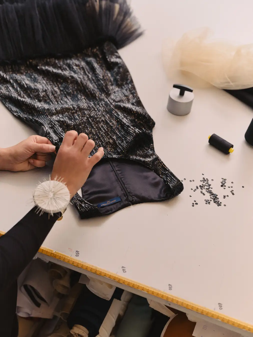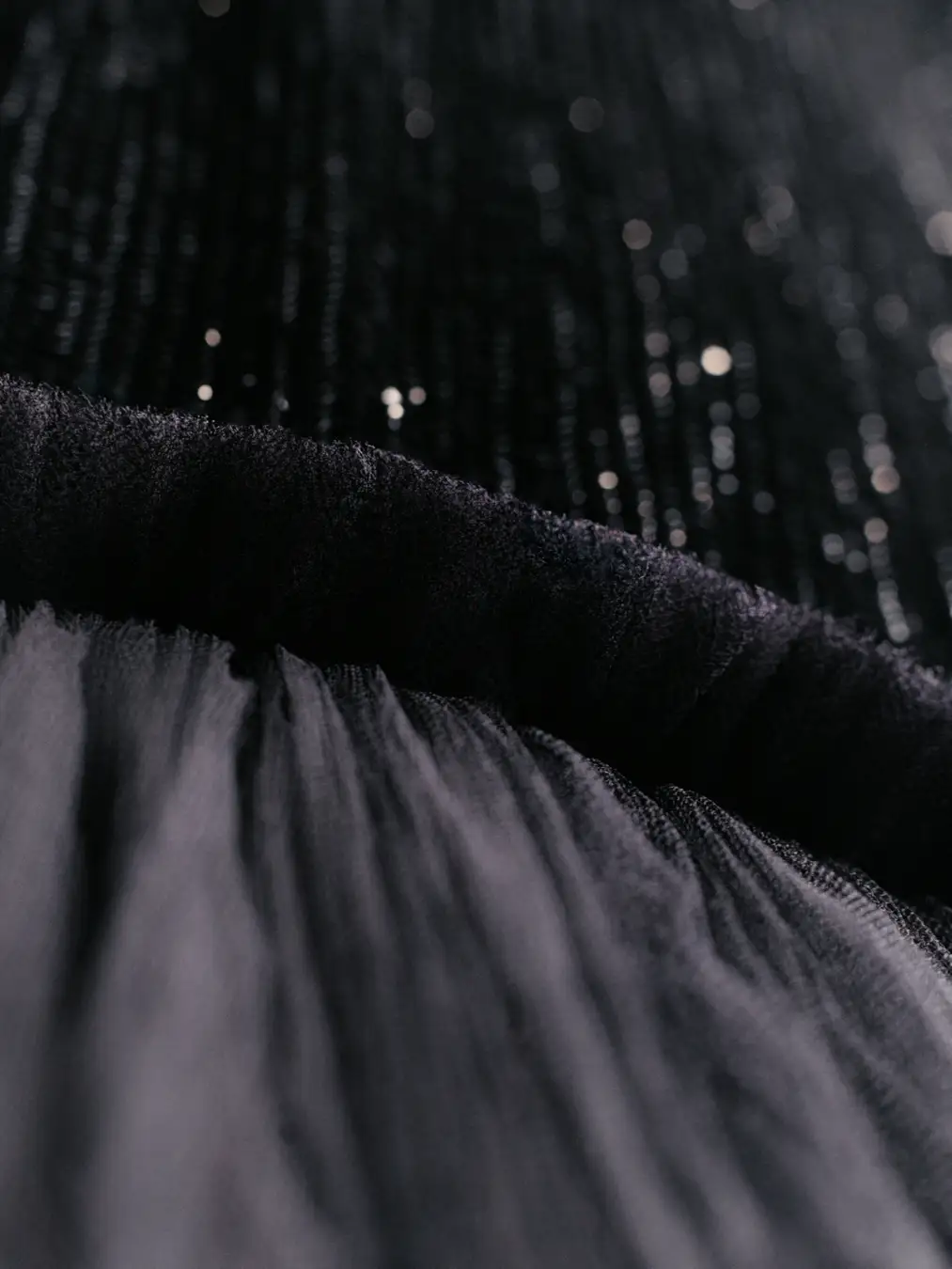 刺繍には直径5mmのブラックのキュベットスパンコールが使用され、リヴィエールスタイルで配置されているため、上下に滑らかに流れるようなデザイン。スパンコール刺繍は5人の職人によってかぎ針で施され、約5万個のキュベットスパンコールを用いて、完成までに約180時間を要しました。