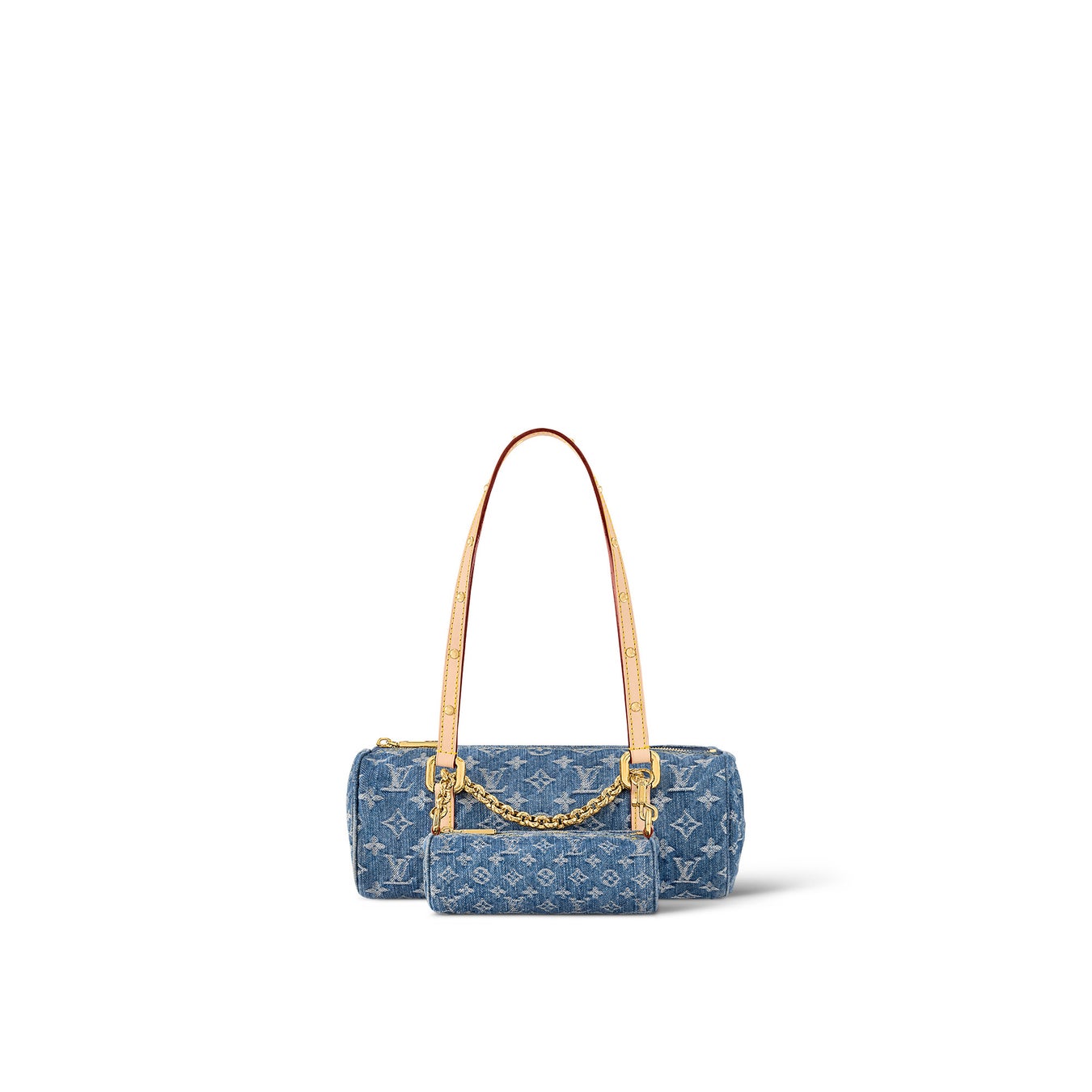 「パピヨン MM」は、バッグに付属するミニチュアサイズの「パピヨン」型のポーチが特徴です。モノグラム・デニムは、モノグラム・パターンをコットンに織り込むことからはじまる、複数の工程を経て完成します。次にコットンデニムをブリーチ加工し、バッグの形状に組み立てます。最後にストーンウォッシュ加工を施すことで、1点1点異なる表情を生み出しています。